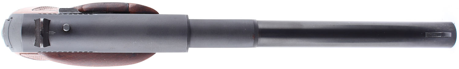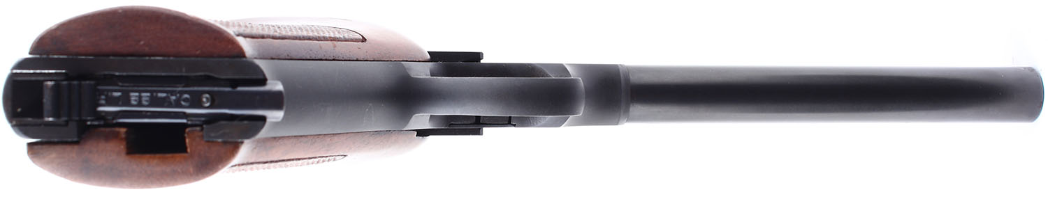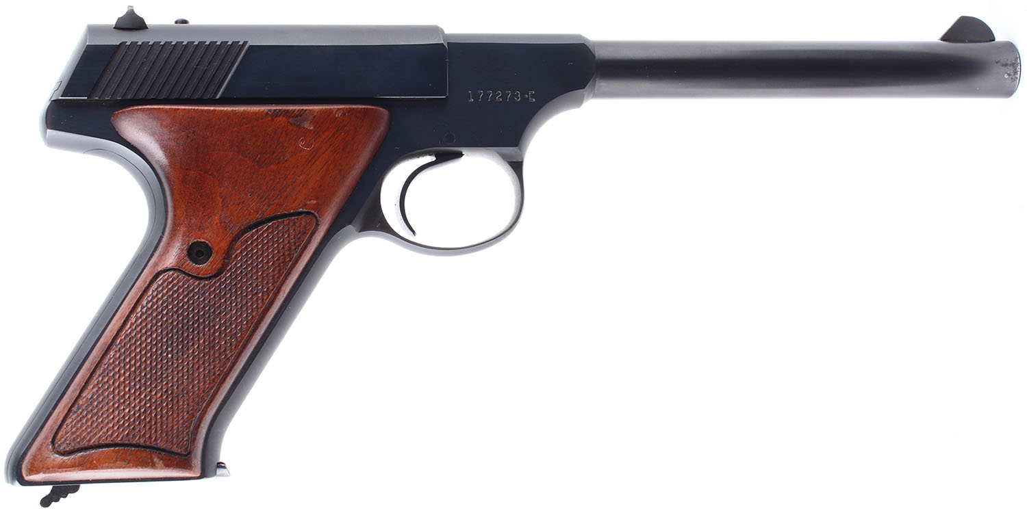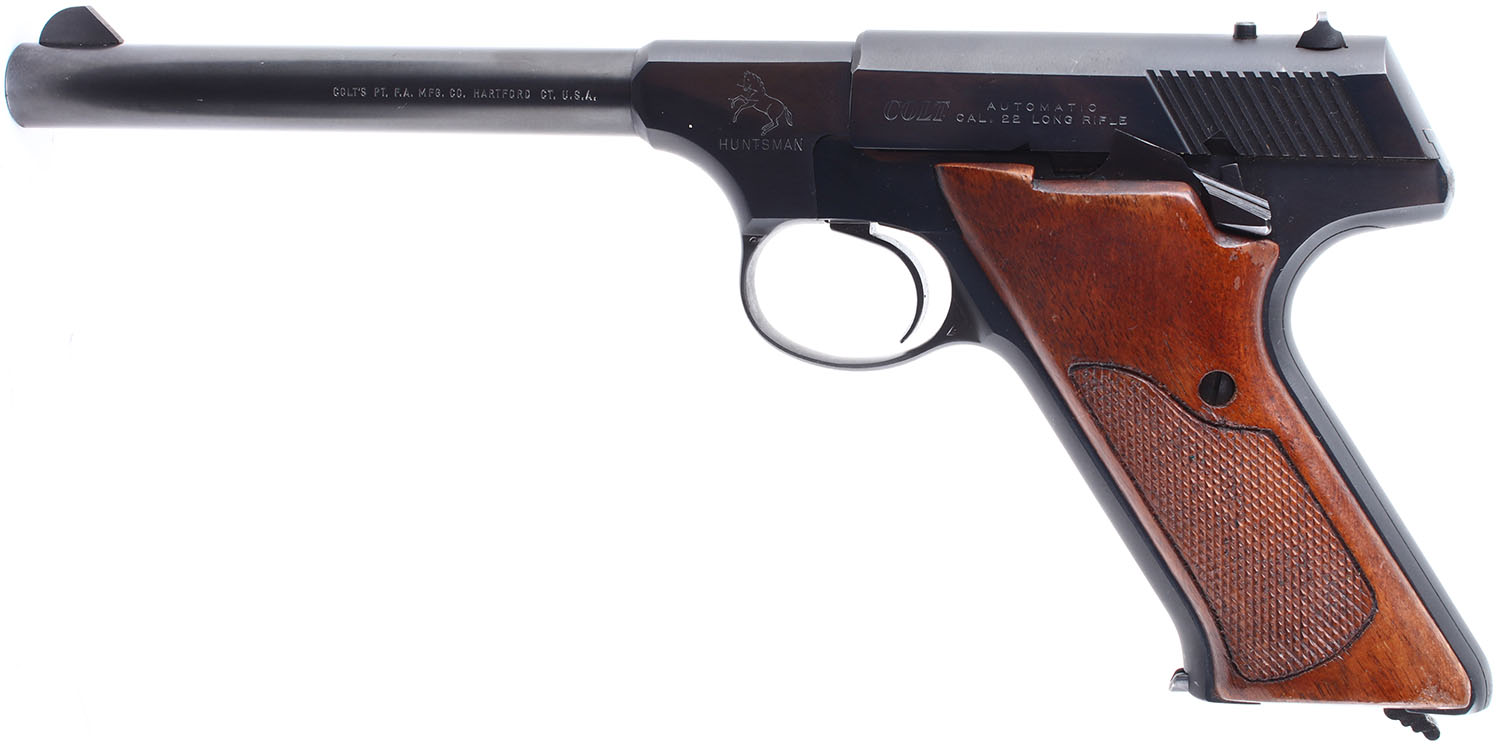 Colt, Huntsman, CAL: .22 LR, MFG: 1965-75, SN: 177273-C, Semi Auto Pistol. 6'' barrel. Checkered wood grips are in very good condition with some handling wear. The blued finish on the frame and barrel rates 97%. Bore is excellent. Mechanically solid with some side to side play in the slide. target sights, front sight is fixed to the barrel and rear sight is set into a dovetail cut. Original magazine. FFL or C&R Req. - Value: 300 to 600
