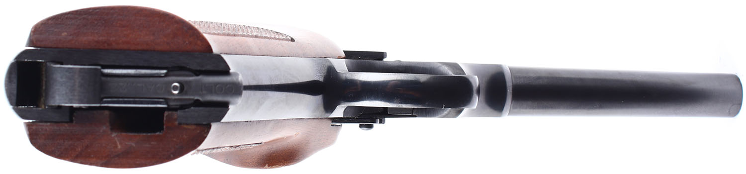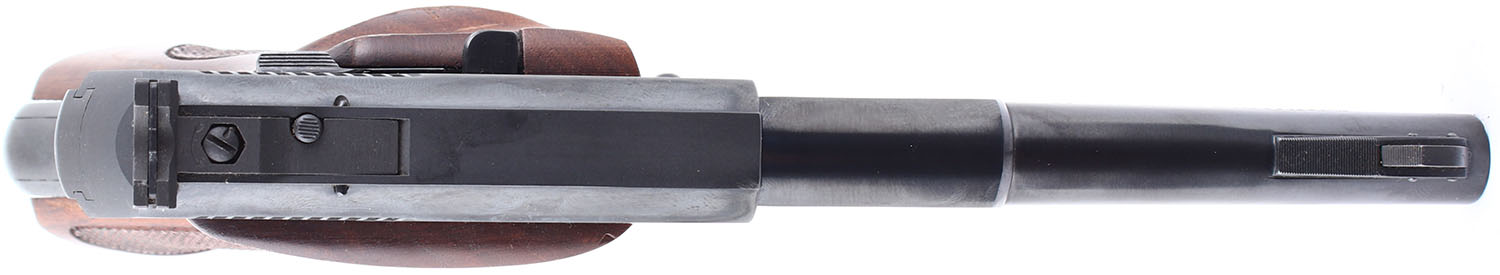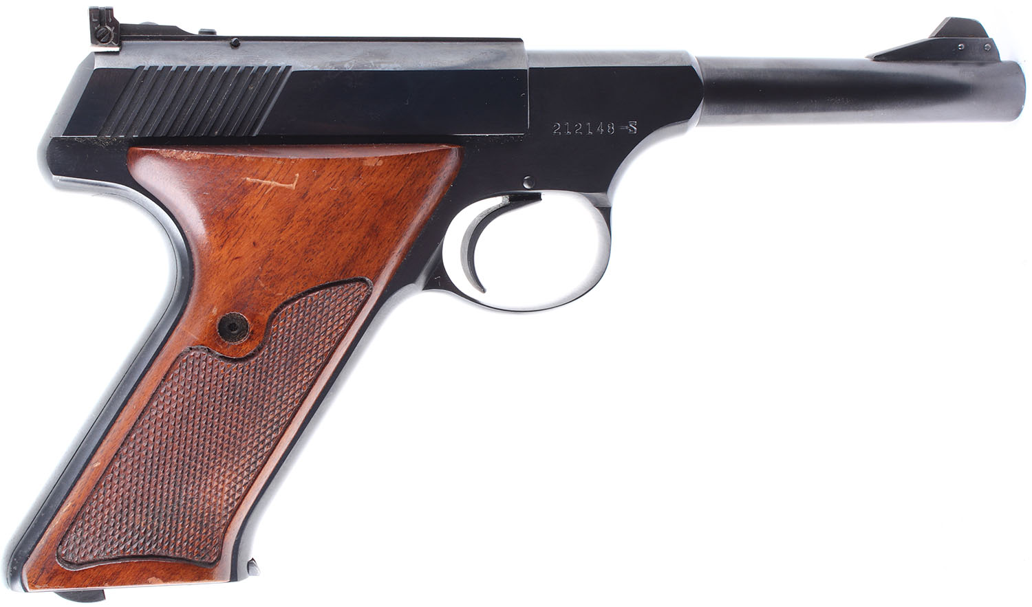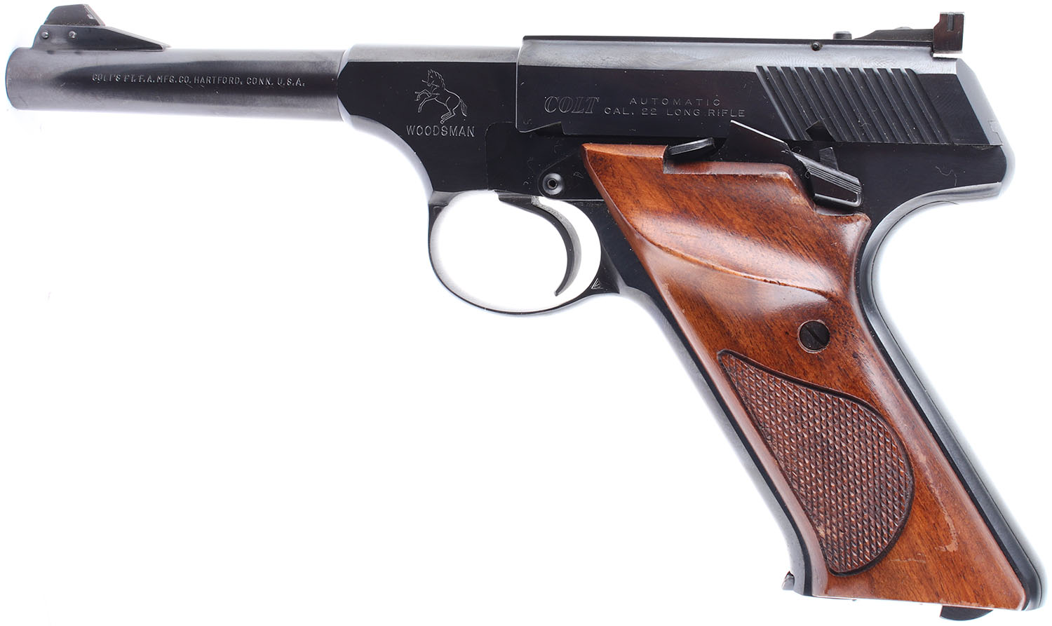 Colt, Woodsman 3rd series, CAL: .22 LR, MFG: 1955-75, SN: 212148S, Semi Auto Pistol. 4 1/2'' barrel. Checkered wood grips are in very good condition with a couple of small chips on the checkering and some handling wear. The blued finish on the frame and barrel rates 98%. Bore is excellent. Mechanically solid with very little side to side play in the slide. target sights, front sight is pinned to the barrel, windage and elevation adjustable rear sight is set into a dovetail cut. Comes with a magazine. FFL or C&R Req. - Value: 500 to 1000