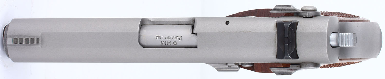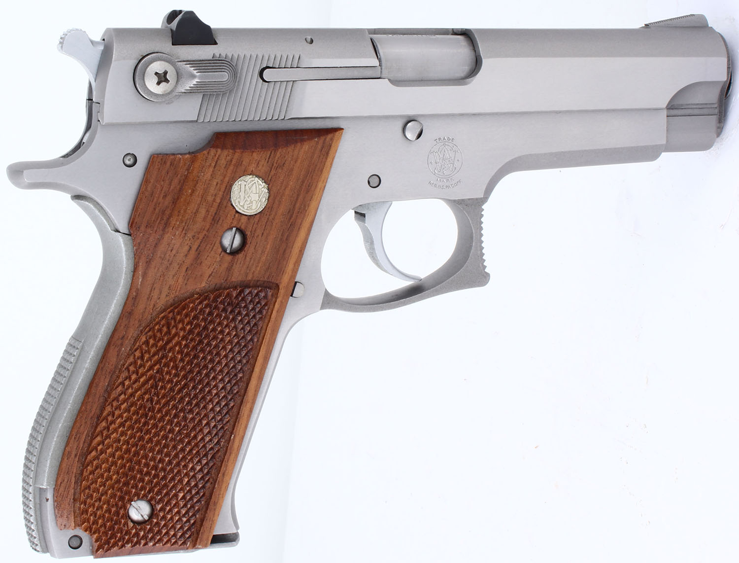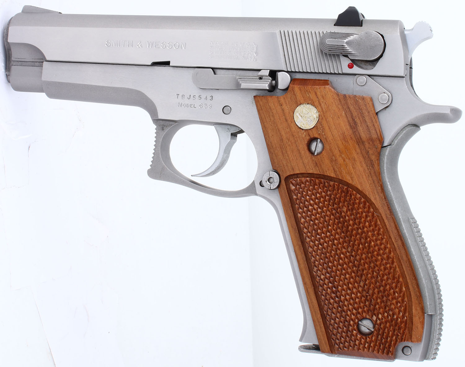 Smith & Wesson, 639, CAL: 9x19mm, MFG: 1981-86, SN: TBJ5543, Semi Auto Pistol. 4'' barrel. Factory checkered wood grips are in excellent condition. The stainless steel finish on the frame and slide rates 98%. Bore is excellent. Mechanically solid with little to no side to side play in the slide. Target sights, stainless front sight is integral to the slide, rear sight is set into a dovetail cut. Comes with two magazines. FFL Req. - Value: 400 to 800