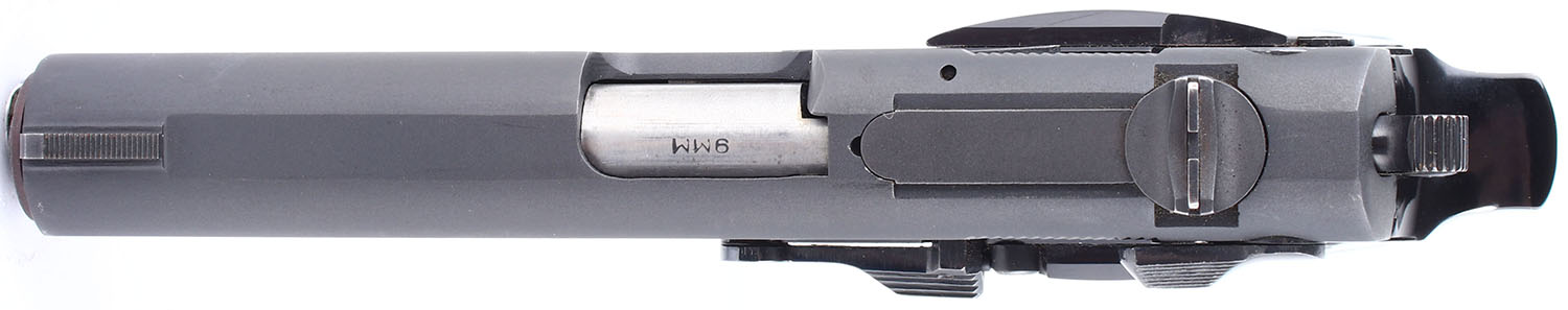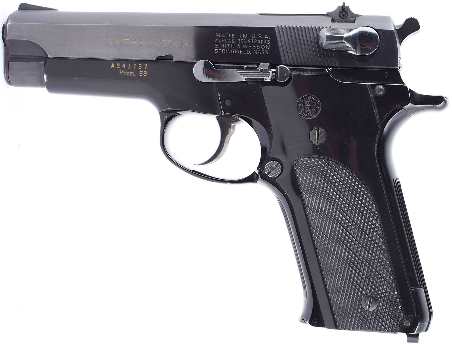 BOXED Smith & Wesson, 59, CAL: 9x19mm, MFG: 1974-75, SN: A241787, Semi Auto Pistol. 4'' barrel. Checkered plastic grips are in very good condition with slight handling wear and some rust in the grip screws. The black finish on the frame rates 97%, and slide rates 98%. Bore is excellent. Mechanically solid with very little side to side play in the slide. Blacked out sights, front serrated post sight is integral to the slide, windage adjustable black rear sight is set into a dovetail cut. Comes in a factory box with two magazines, cleaning rod and brush, and users manual. FFL or C&R Req. - Value: 300 to 600