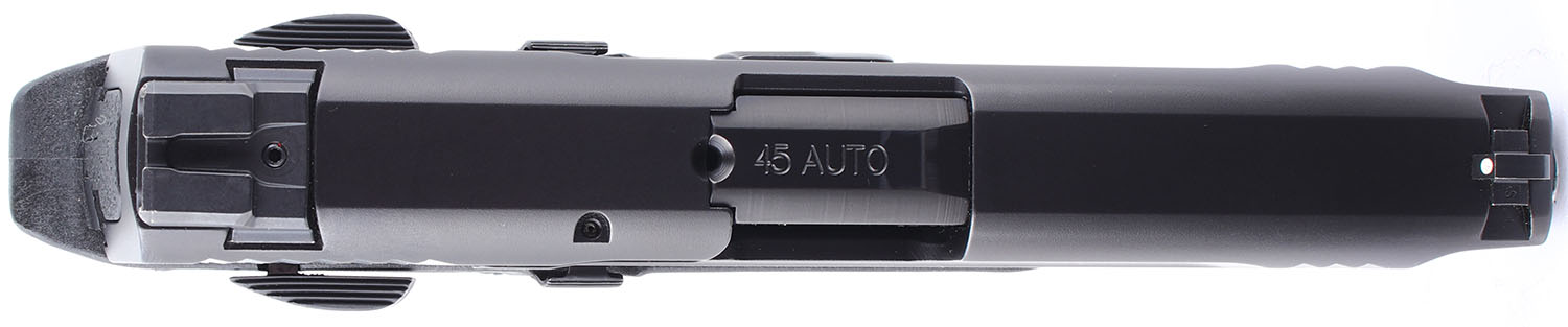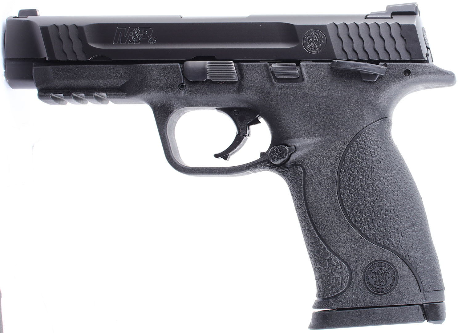 CASED Smith & Wesson, M&P45, CAL: 45 ACP, MFG: Modern, SN: DVU0563, Semi Auto Pistol. 4 1/2'' barrel. The textured plastic grip frame is in excellent condition with some wear. The black finish on the slide rates 99%. Bore is excellent. Mechanically solid with very little side to side play in the slide. 3 dot white combat sights, both front and rear sights are set into dovetail cuts, the rear sight has a set screw. Comes in a factory plastic hard case with five 10 round magazines, two extra back straps, and a lock. FFL Req. - Value: 300 to 500