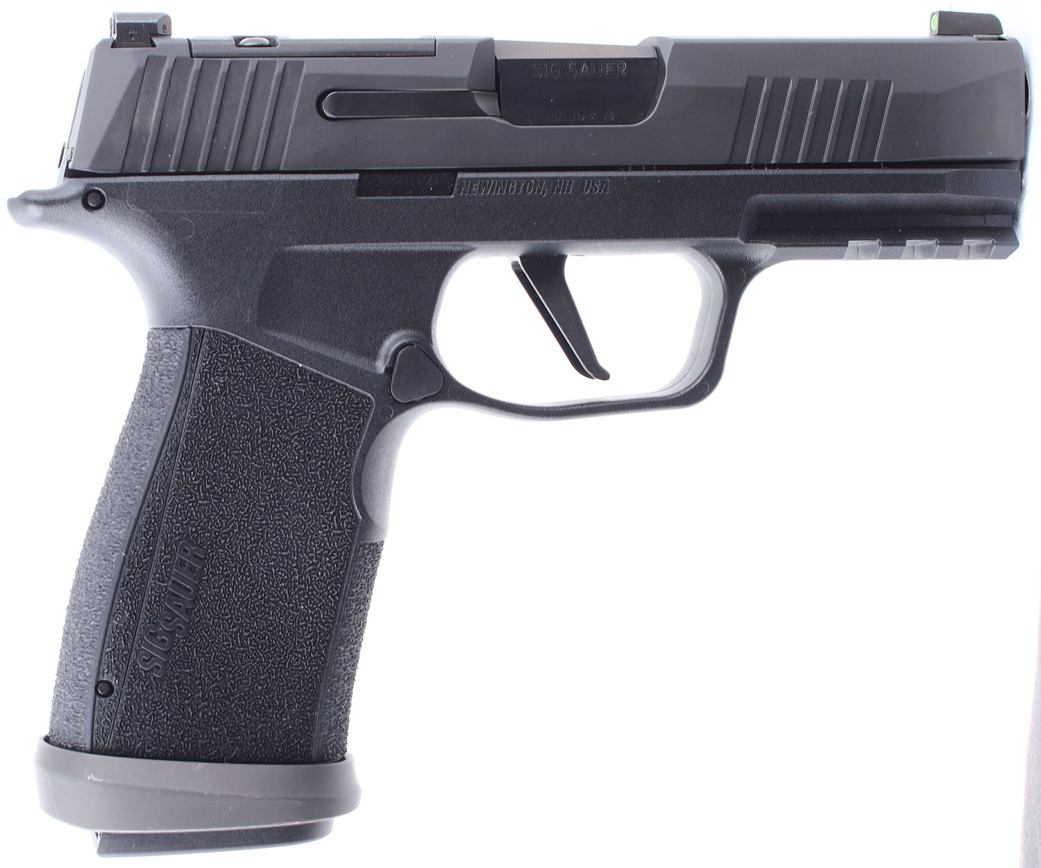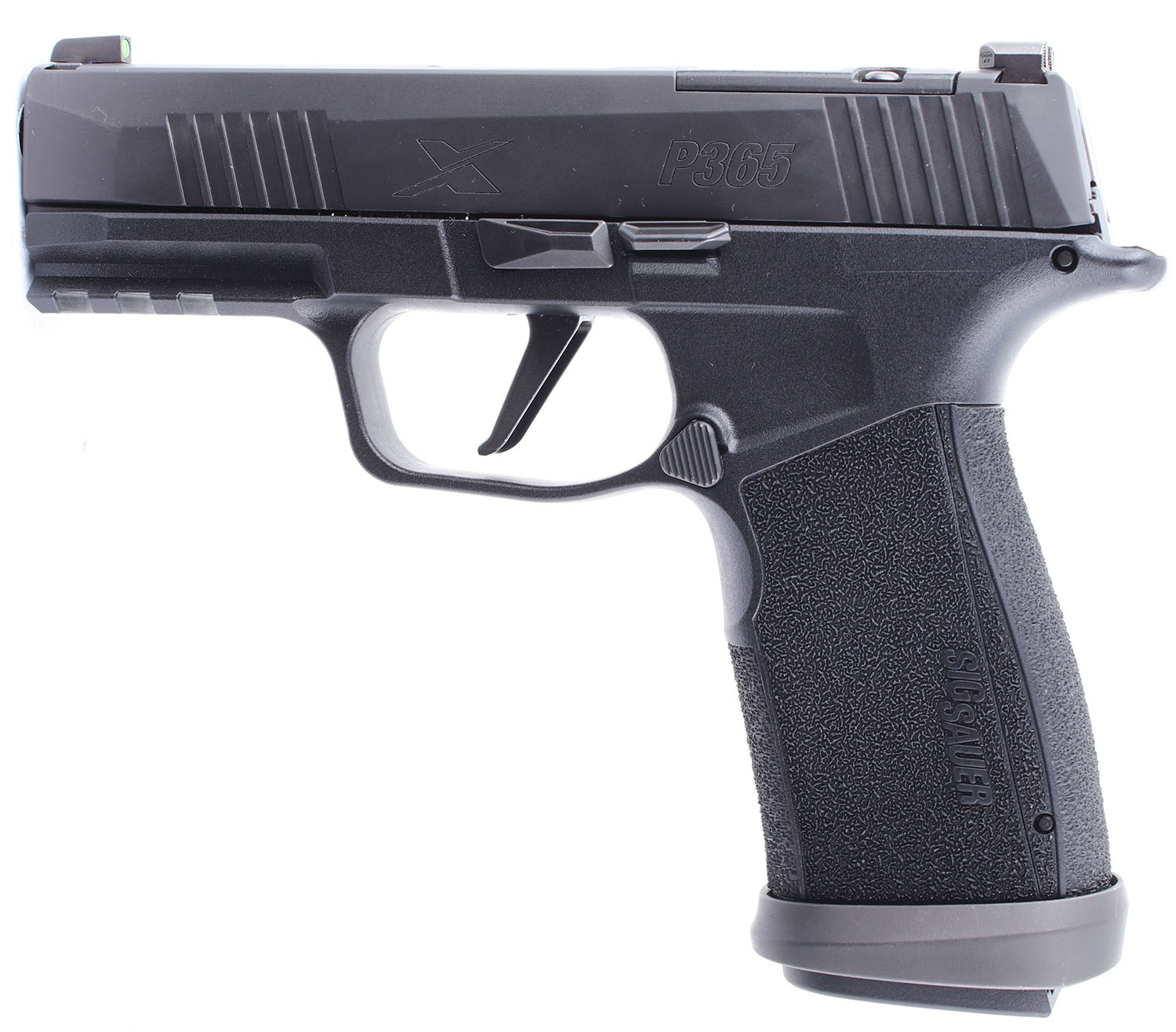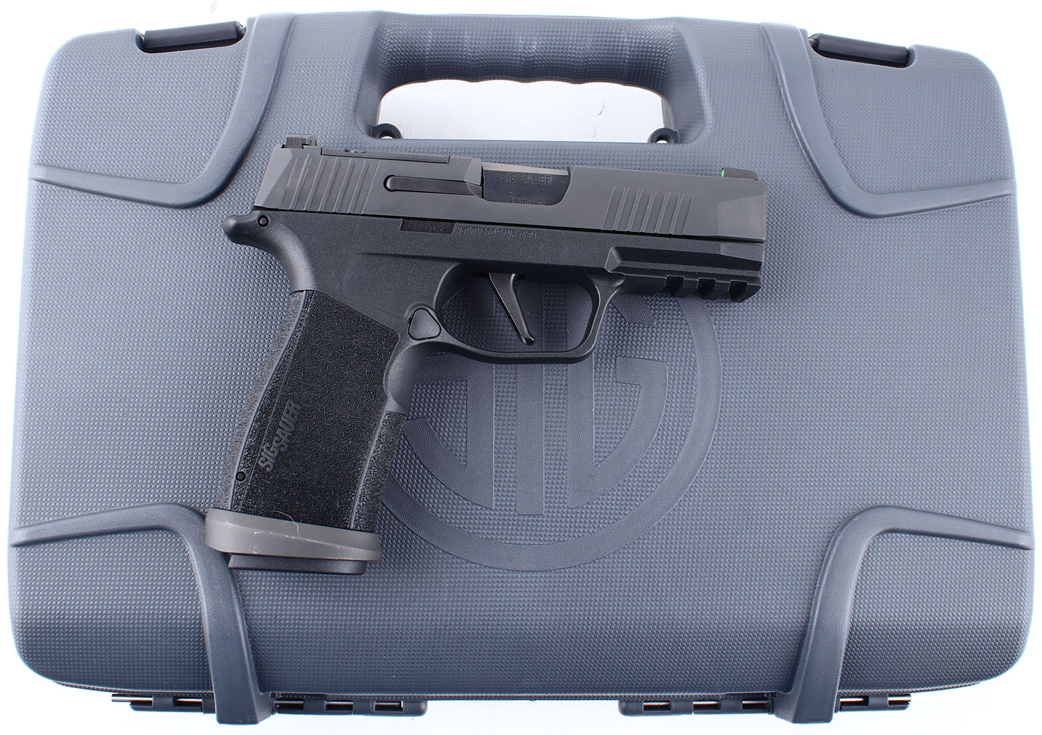CASED Sig Sauer, P365 X Macro Tac Ops, CAL: 9x19mm, MFG: Modern, SN: 66G311545, Semi Auto Pistol. 3 1/2'' barrel. The checkered polymer grip frame is in excellent condition. The finish on the slide rates 99% and has very little handling wear. Bore is excellent. Mechanically solid, like new. 3 dot day night combat sights, the front and rear sights are set in dovetail cuts on the slide, the slide optics ready. Gun shop display model, comes in the factory hard plastic case with four 17 round magazines, a rugger grip band (for display), two extra back straps (for a total of three, one small, one medium, and one large), a lock, a Sig Sauer sticker, an owners manual, and other related paperwork. FFL Req. - Value: 450 to 750