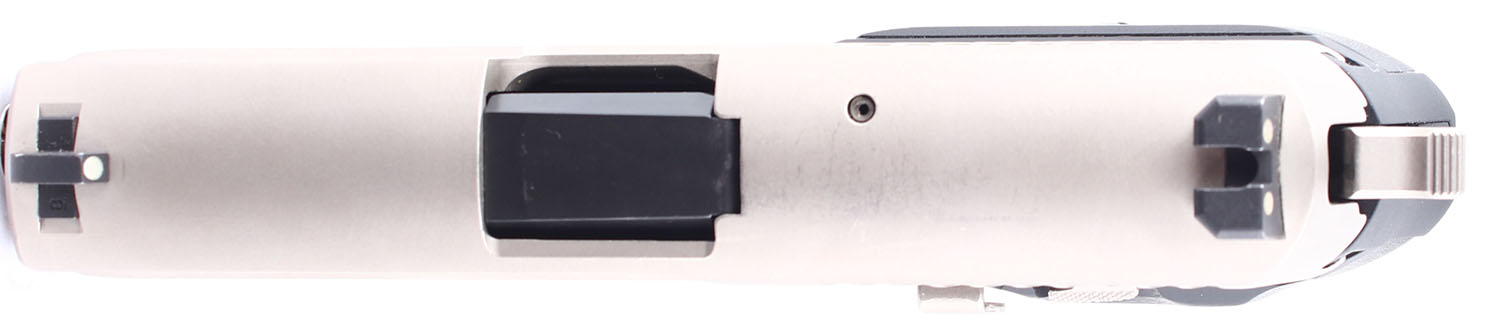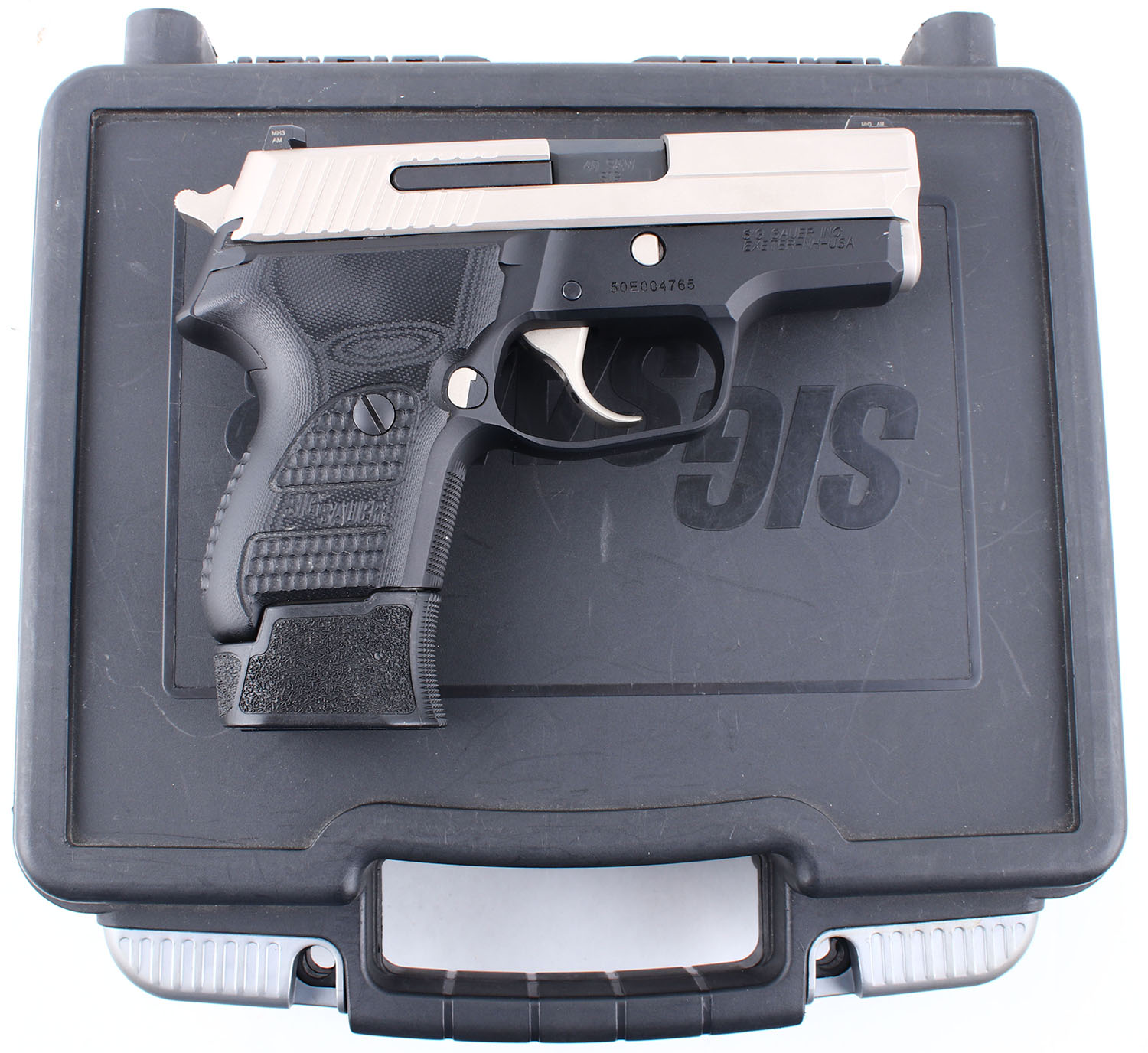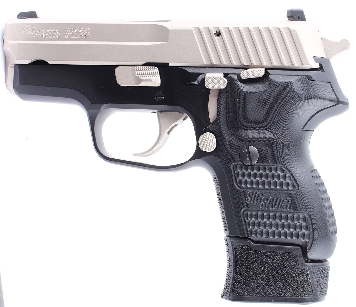 CASED Sig Sauer, P224, CAL: 40 SW, MFG: Modern, SN: 50E004765, Semi Auto Pistol. 3 1/4'' barrel. The textured plastic grips are in excellent condition with some wear. The black finish on frame rates 97%, and the stainless finish on the slide rates 94% with some wear including some scratches on the top of the slide in front of the rear sight. Bore is excellent. Mechanically solid with very little side to side play in the slide. 3 dot white combat sights, front and rear sights are set into dovetail cuts. Comes in the factory hard plastic case with a chamber flag, one ten round magazine, two extended 12 round magazines, and an owners manual. FFL Req. - Value: 500 to 1100