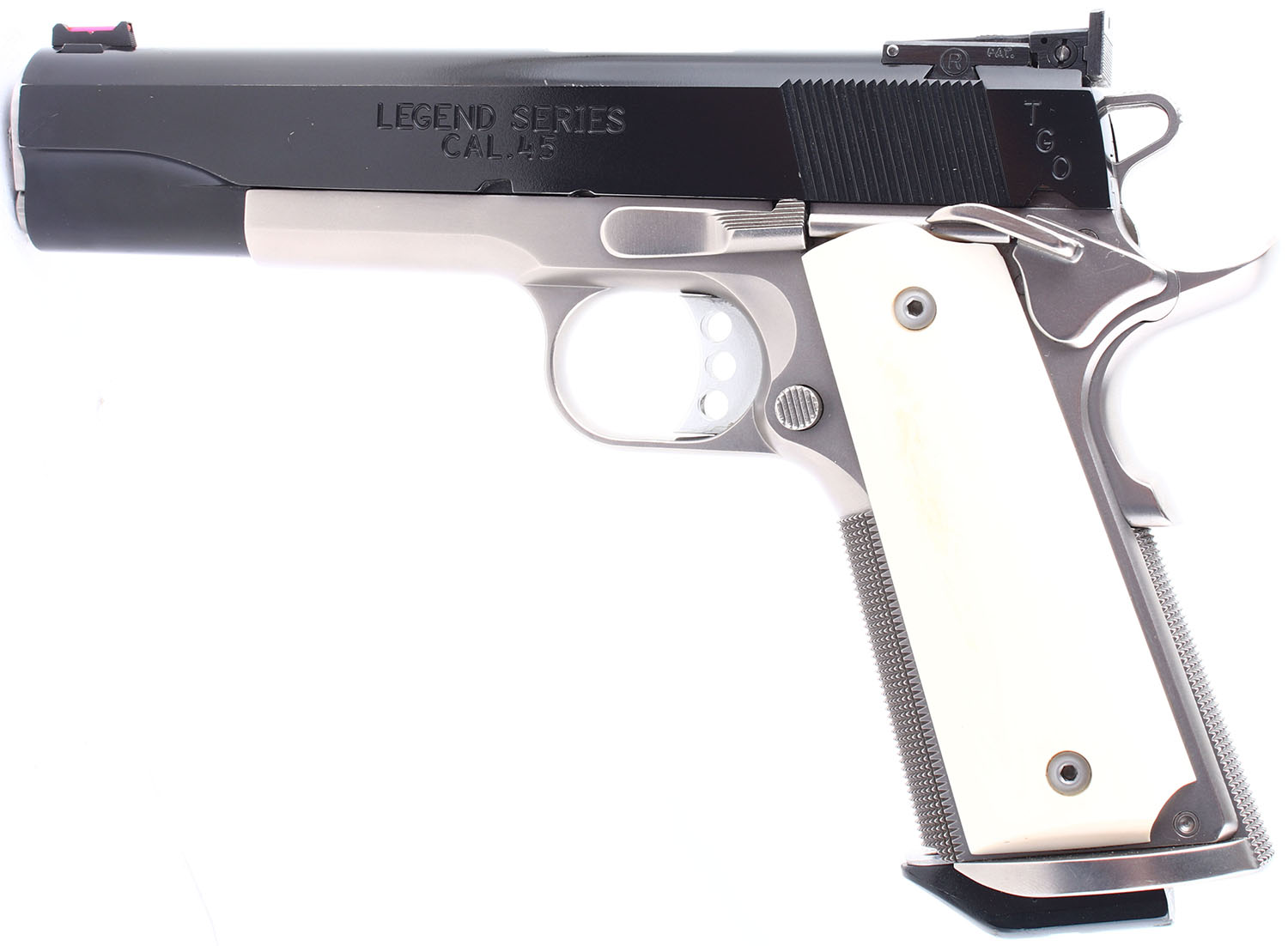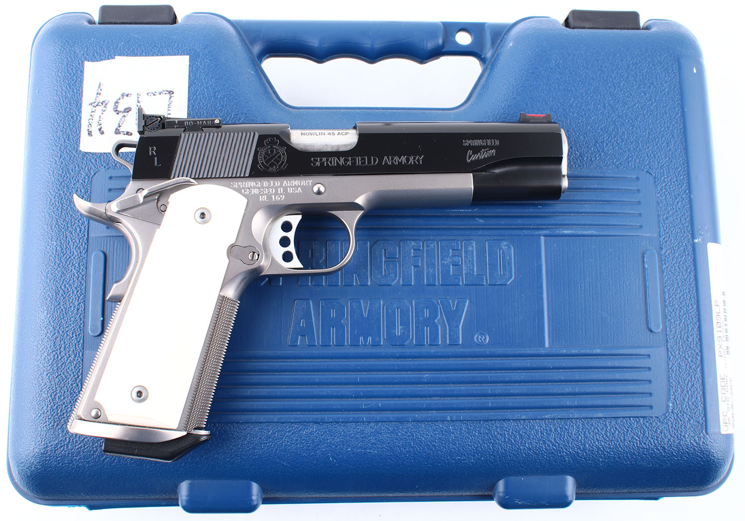 CASED Springfield Armory, Legend Series 1911 A1, CAL: 45 ACP, MFG: Modern, SN: RL 169, Semi Auto Pistol. 5'' barrel. The ivory grips are in excellent condition. The stainless finish on frame rates 99%, and the black finish on the slide rates 97% with some wear and small scratches. Bore is excellent. Mechanically excellent with no perceptible side to side play in the slide. Target sights set in dovetail cuts, blacked out windage and elevation adjustable rear sight, red fiber optic front sight. The gun comes with a Nowlin barrel installed (these barrels typically go for around $250), and aftermarket ivory grips marked on the inside ''Handcrafted for Colt Firearms'' (Ivory 1911 grips tend to go for approximately $500-$700). Comes in a S.A hard plastic case with one magazine, various alan keys and tools, a bore brush, and an owners manual and other related paperwork. FFL Req. - Value: 1500 to 2500