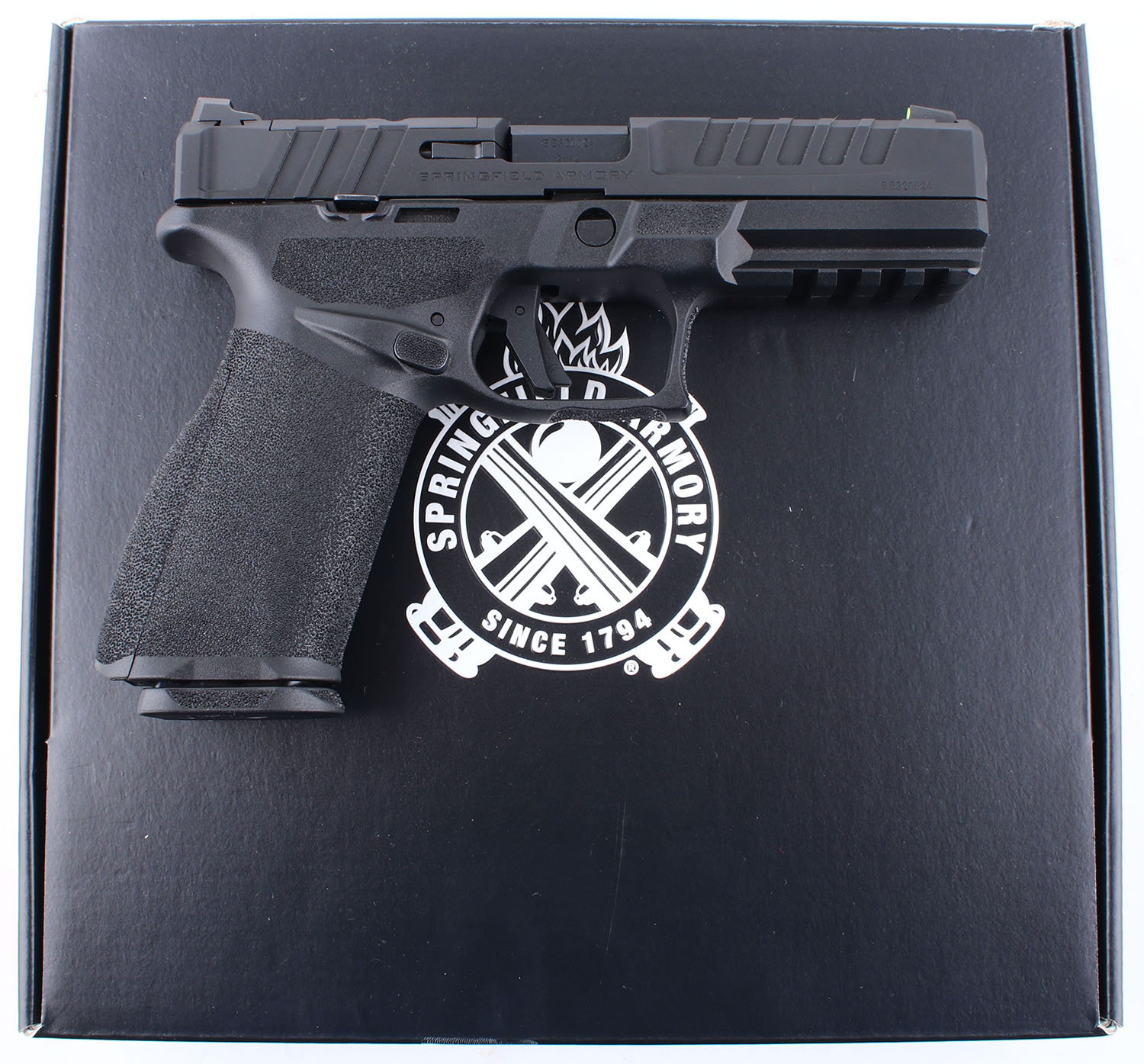 BOXED and CASED Springfield Armory (Croatia), Echelon, CAL: 9x19mm, MFG: Modern, SN: BE320024, Semi Auto Pistol. 4 1/2'' barrel. The checkered polymer grip frame is in excellent condition with light handling wear. The finish on the slide rates 98% and has very little handling wear. Bore is excellent. Mechanically solid, like new. Factory U notch rear sight and high vis front night sight, slide is optics ready. Comes in the factory box and soft pistol case with one 17 round magazine, one 20 round magazine, a three round extension for the 17 round magazine, a speed loader, two extra backstraps, optics screws and pins, an owners manual and other related paperwork. FFL Req. - Value: 400 to 600