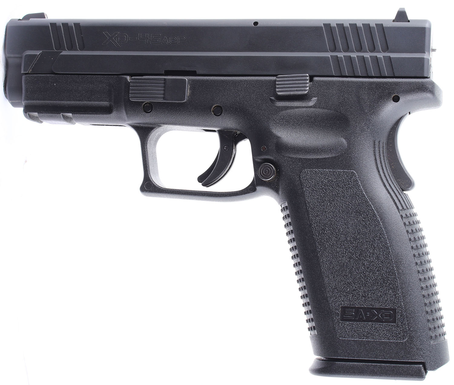 Springfield Armory, XD - 45 ACP, CAL: 45 ACP, MFG: Modern, SN: XD727009, Semi Auto Pistol. 4'' barrel. The plastic grip frame is in excellent condition. The black finish on the slide rates 98% with slight wear. Bore is very good, the grooves between the rifling are darkening. Mechanically solid with very little side to side play in the slide. 3 dot white combat sights are set in dovetail cuts. With two 13 round magazines. FFL Req. - Value: 200 to 500