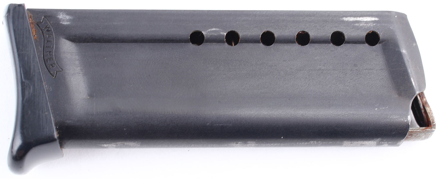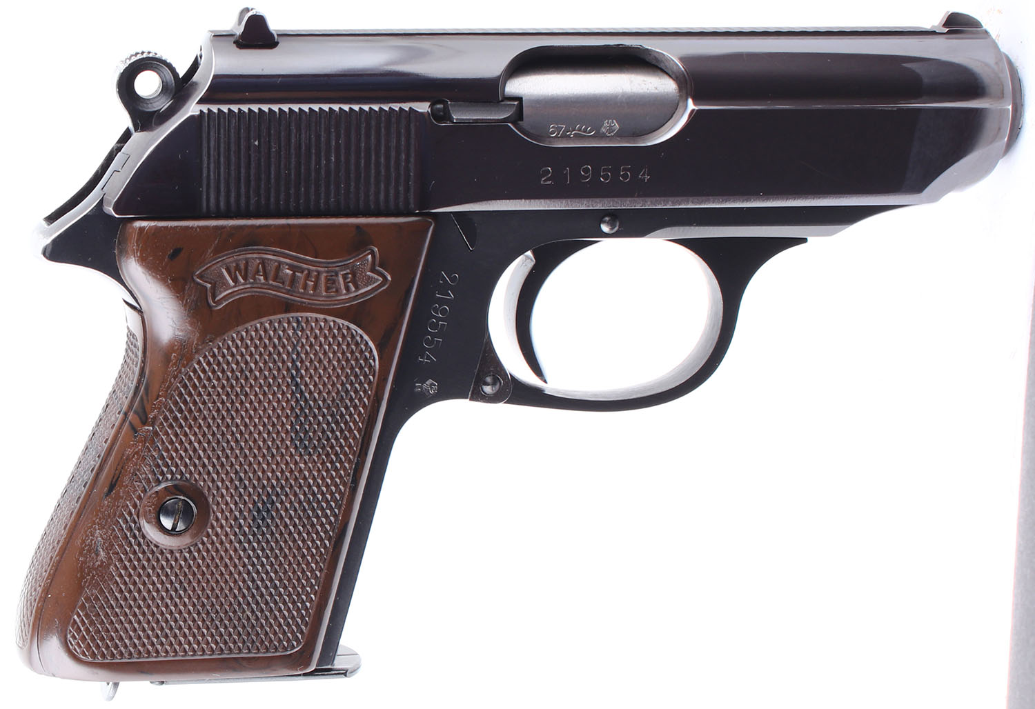 Walther, PPK, CAL: 7.65mm (32ACP), MFG:1967, SN: 219554, Semi Auto Pistol. 3 1/4'' barrel. The plastic grips are in excellent condition with some handling wear. Blued frame rates 97% with slight wear and little rust, the bluing on the slide has patinaed to a deep even plumb tone and rates 97% with slight wear. The barrel has several markings near the chamber including: 67 denoting the year of production, an antler proof mark, and an iron eagle. There is an iron eagle alongside the serial number on the right hand side of the frame, as well as one alongside markings on the left hand side of the slide. Bore is excellent. Mechanically solid with very little side to side play in the slide. The sights took on the same plumb color of the slide, front sight is integral to the slide, rear sight is set in a dovetail cut. Comes with two magazines in a generic soft pistol case. FFL or C&R Req. - Value: 800 to 1600