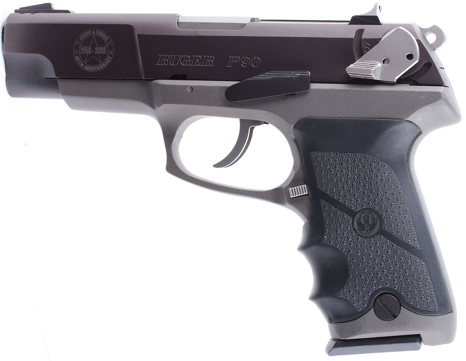 CASED Ruger, P90 (45 Years of Guns and Ammo Special Edition), CAL: 45 ACP MFG: Modern, SN: GS45-0369, Semi Auto Pistol. 4 1/2'' barrel. The rubber grip is in excellent condition. The frame rates 98% with light handling wear. The finish on the slide rates 97% with some wear. Bore is very good. Mechanically solid with some side to side play in the slide. 3 dot white combat sights, front sight is pinned to the slide and rear is set in a dovetail cut on the slide. Comes in the factory hard plastic case with four magazines and a safety pamphlet. FFL Req. - Value: 300 to 500