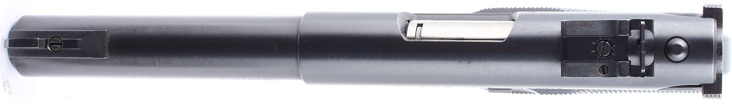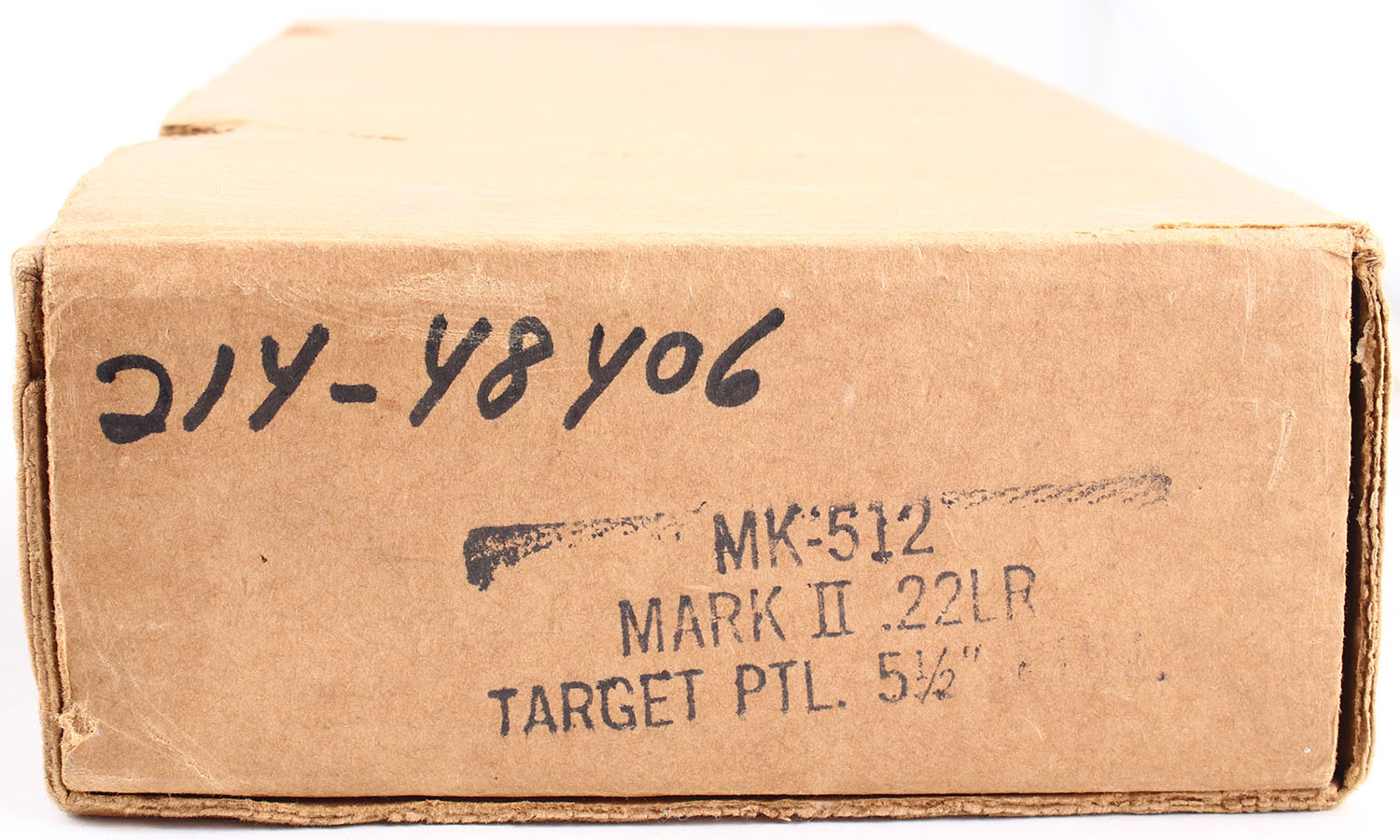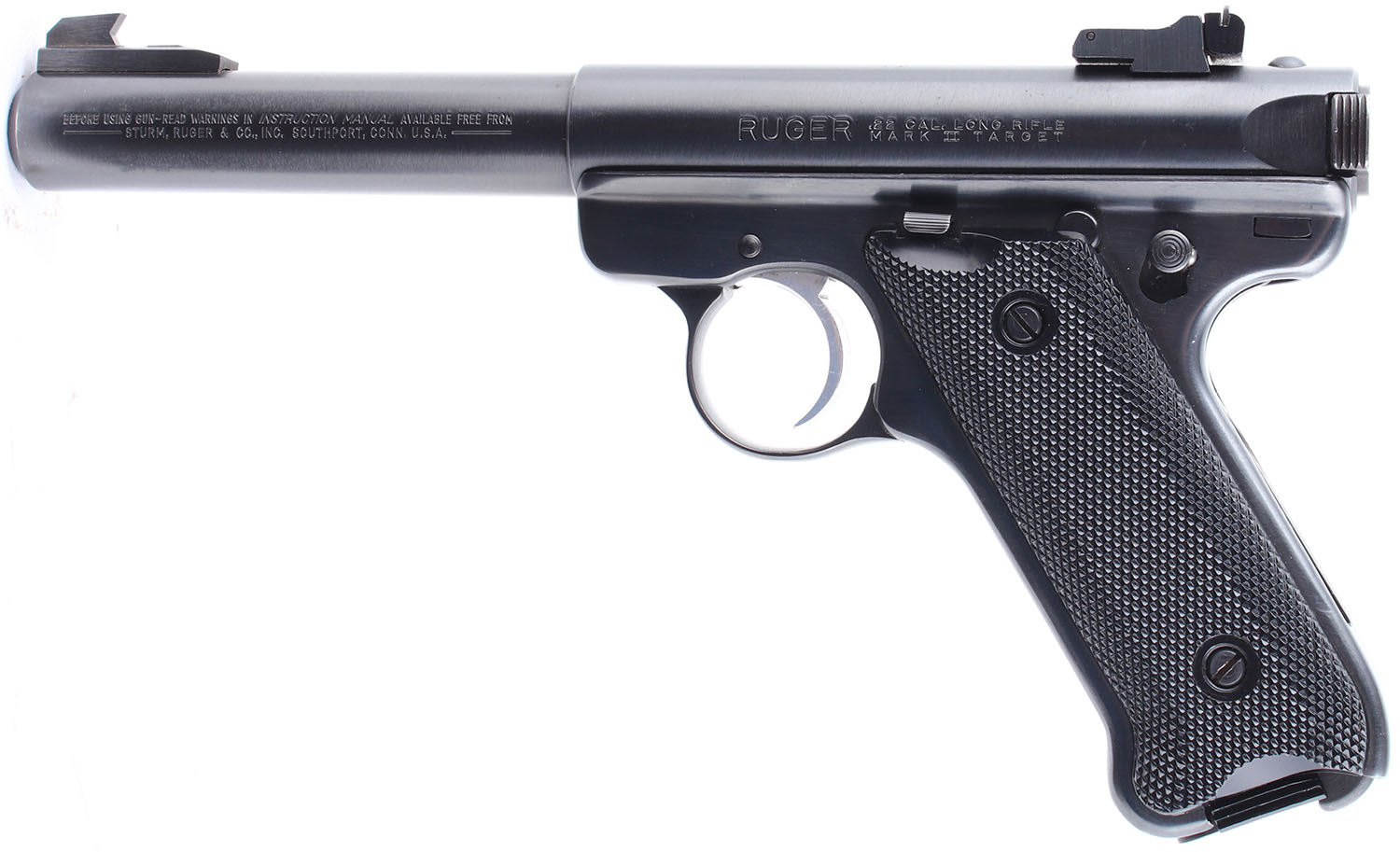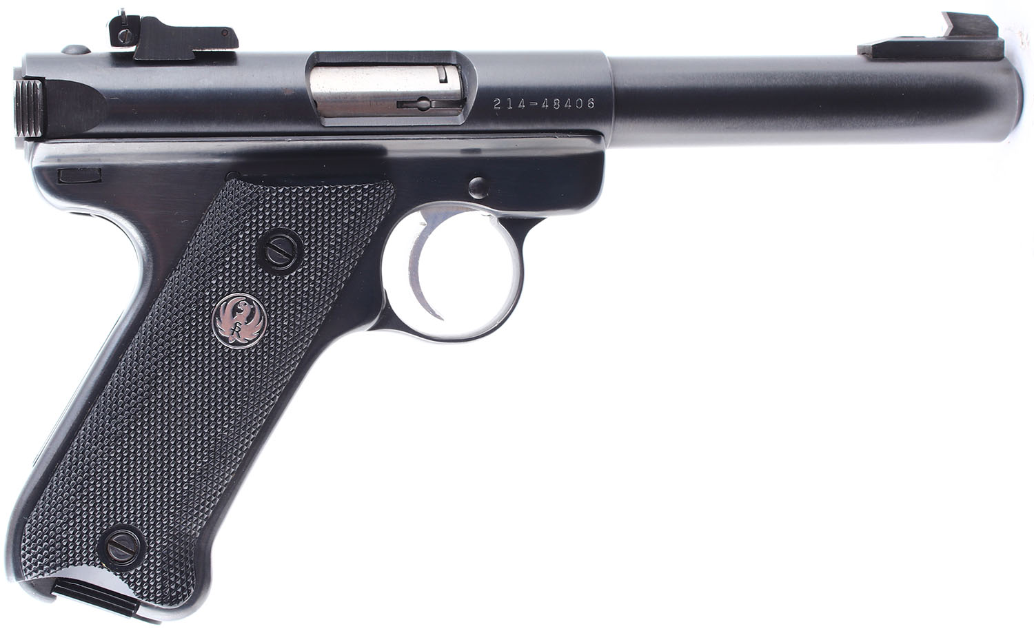 BOXED Ruger, Mark II Target, CAL: 22LR, MFG: 1988, SN: 214-48406, Semi Auto Pistol. 5 1/2'' barrel. The checkered plastic grips are in excellent condition with slight patina on the grip screws. The frame and slide rate 97%, there are a few small splotches of rust on the finish of the slide and frame. Bore is excellent. Mechanically solid. Blacked out target sights, front sight is screwed to the top of the barrel, the rear windage and elevation adjustable sight is set in a dovetail cut on the barrel. Comes in the factory box, with the protective outer box, two magazines, an owners manual, and other related paperwork. FFL Req. - Value: 250 to 500