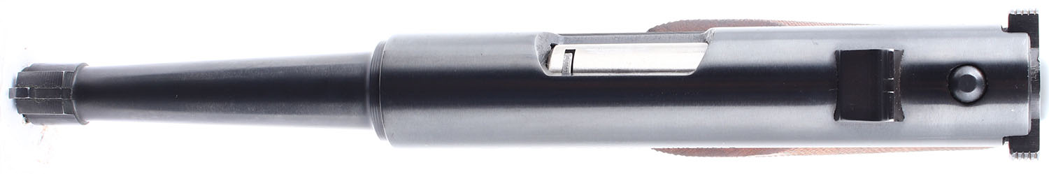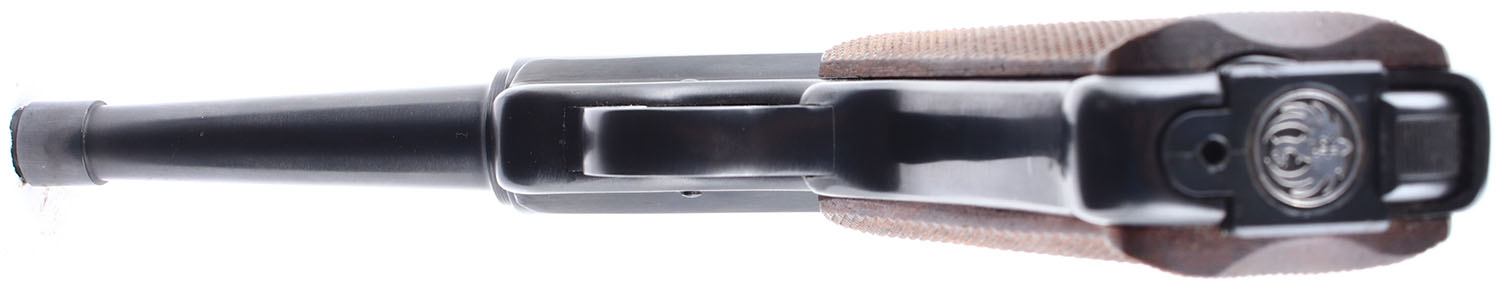 Ruger, Standard, CAL: 22LR, MFG: 1973, SN: 12-13077, Semi Auto Pistol. 4 3/4'' barrel. The checkered wood grips are in very good condition with some handling wear. The finish on the barrel and frame rates 98% and has slight handling wear. Bore is excellent. Mechanically solid. Blacked out target sights, the front sight is pinned into a notch on the front of the barrel, the rear sight is set in a dovetail cut on the barrel. Comes with one magazine. FFL or C&R Req. - Value: 250 to 500