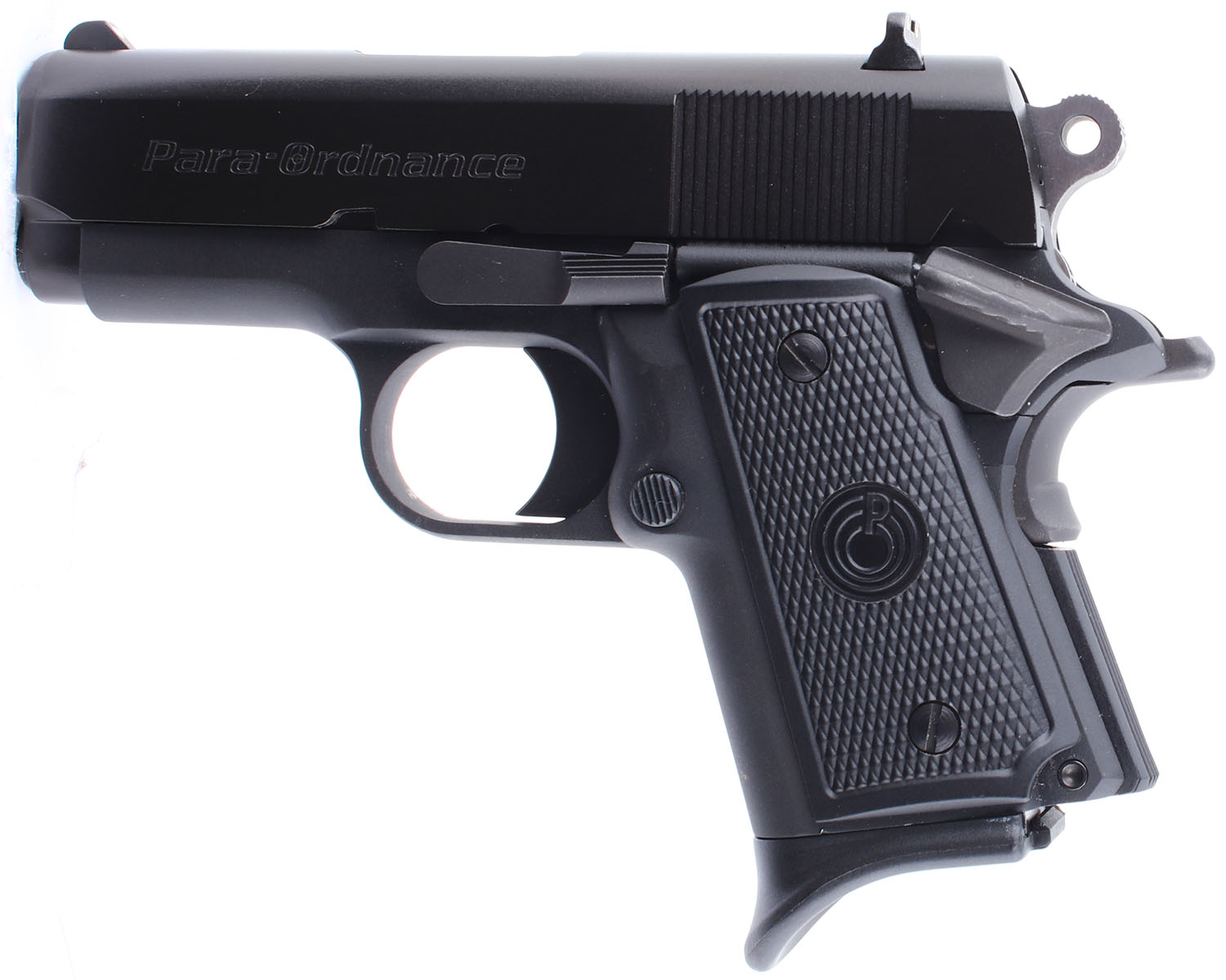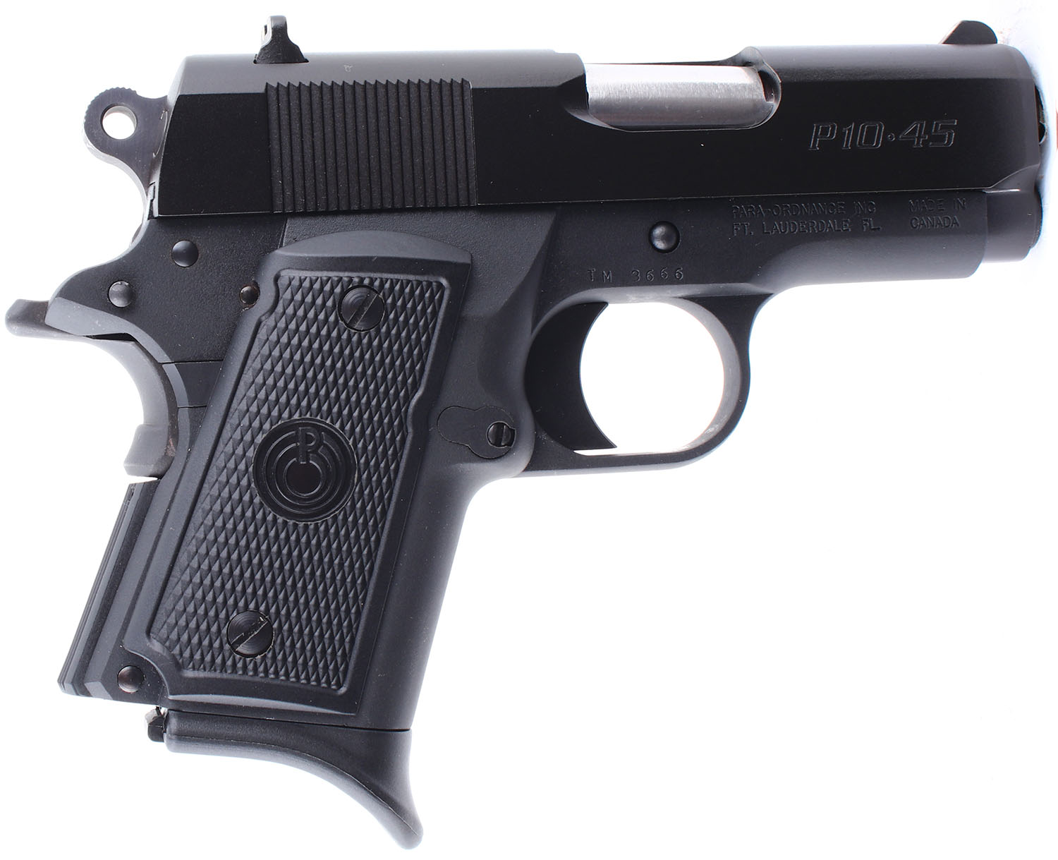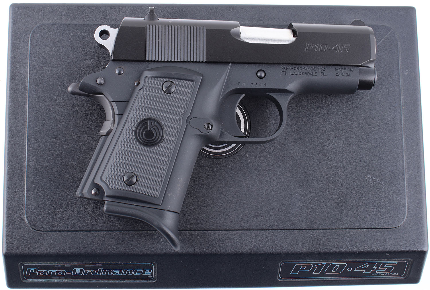 CASED Para Ordnance, P10 45, CAL: .45 ACP, MFG: Modern, SN: TM 3666, Semi Auto Pistol, single action only. 3'' barrel. The factory black checkered polymer grips are in excellent condition. The black finish on the slide and frame is very good, the slide rates 98% and the frame rates 96%. Bore is excellent. Mechanically solid with hardly any side to side play in the slide. 3 dot white combat sights, front sight is integral to the slide, rear sight is set in a dovetail cut. Comes in the factory case with one flush fitting 10 round magazine and one extended 15 round magazine. FFL Req. - Value: 500 to 1000