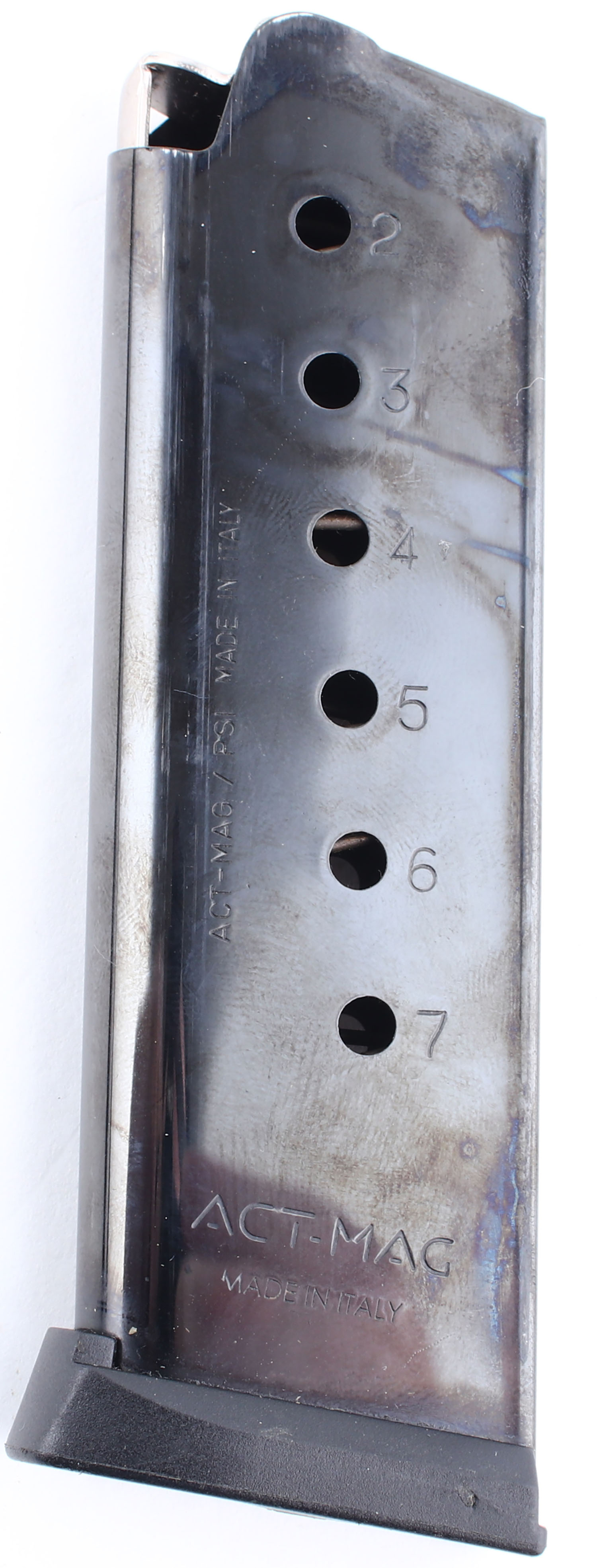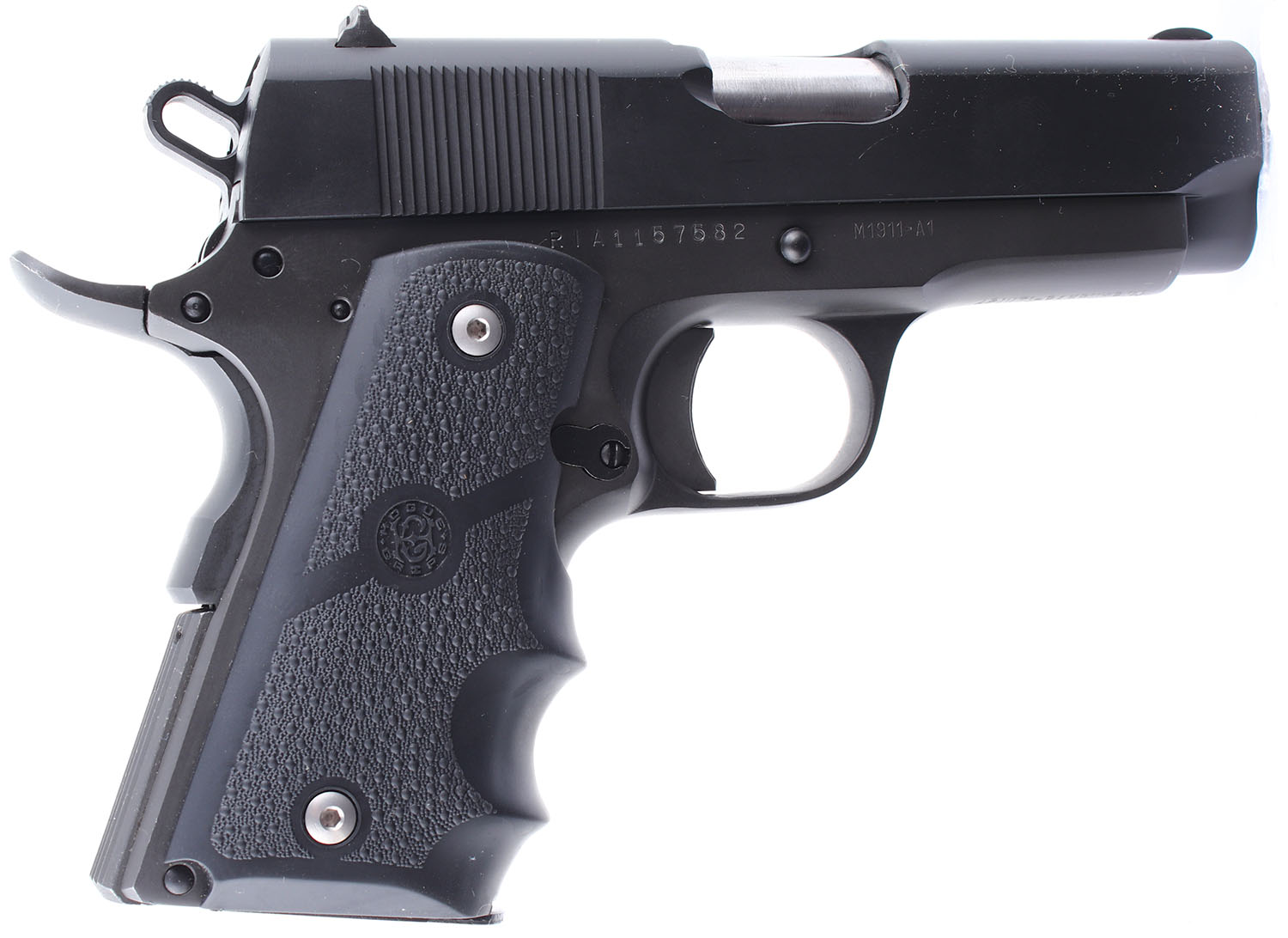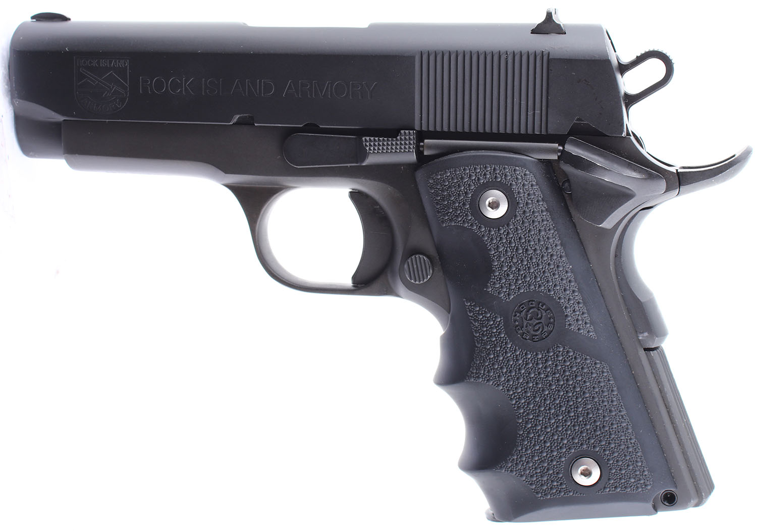 CASED Rock Island Armory, 1911 A1 (Officer), CAL: .45 ACP, MFG: Modern, SN: RIA1157582, Semi Auto Pistol, single action only. 3 1/2'' barrel. The rubber finger grooved Hogue grips are in very good condition. The black finish on the slide and frame is very good, the slide and frame both rate 98%. Bore is excellent with some copper from jacketed bullets left on the edges of the riffling groves. Mechanically solid with little to no side to side play in the slide. Blacked out iron sights, front sight is integral to the slide, rear sight is set in a dovetail cut. Comes in the factory case with one factory 7 round magazine and one ACT-MAG 7 round magazine. FFL Req. - Value: 300 to 600