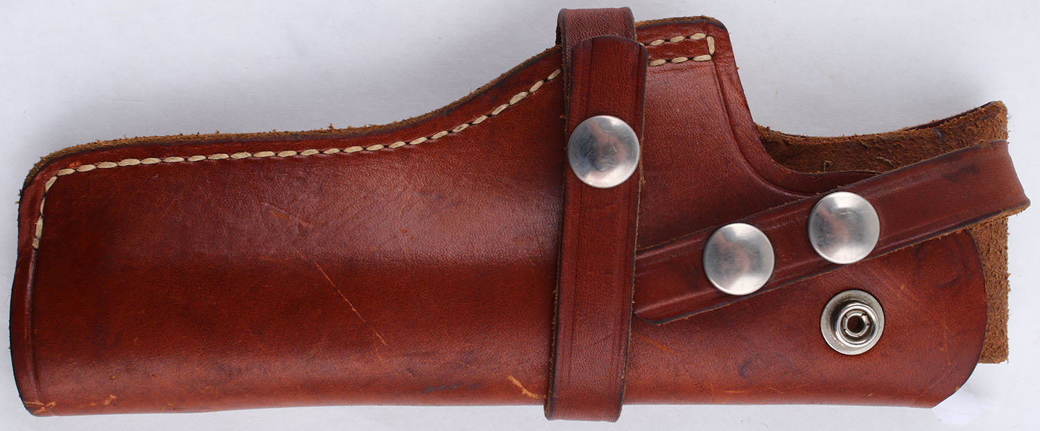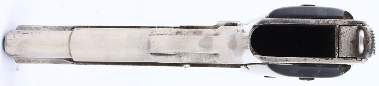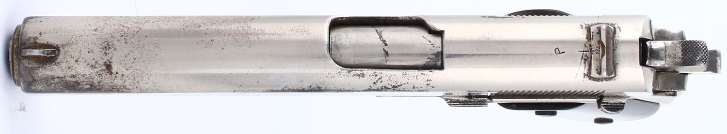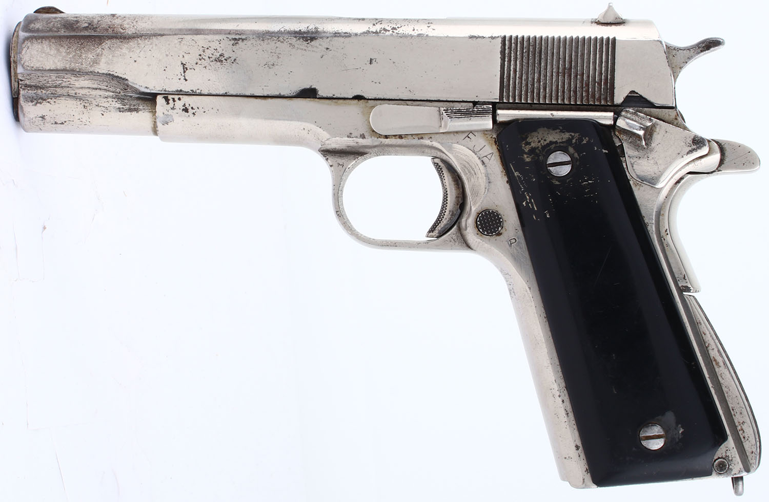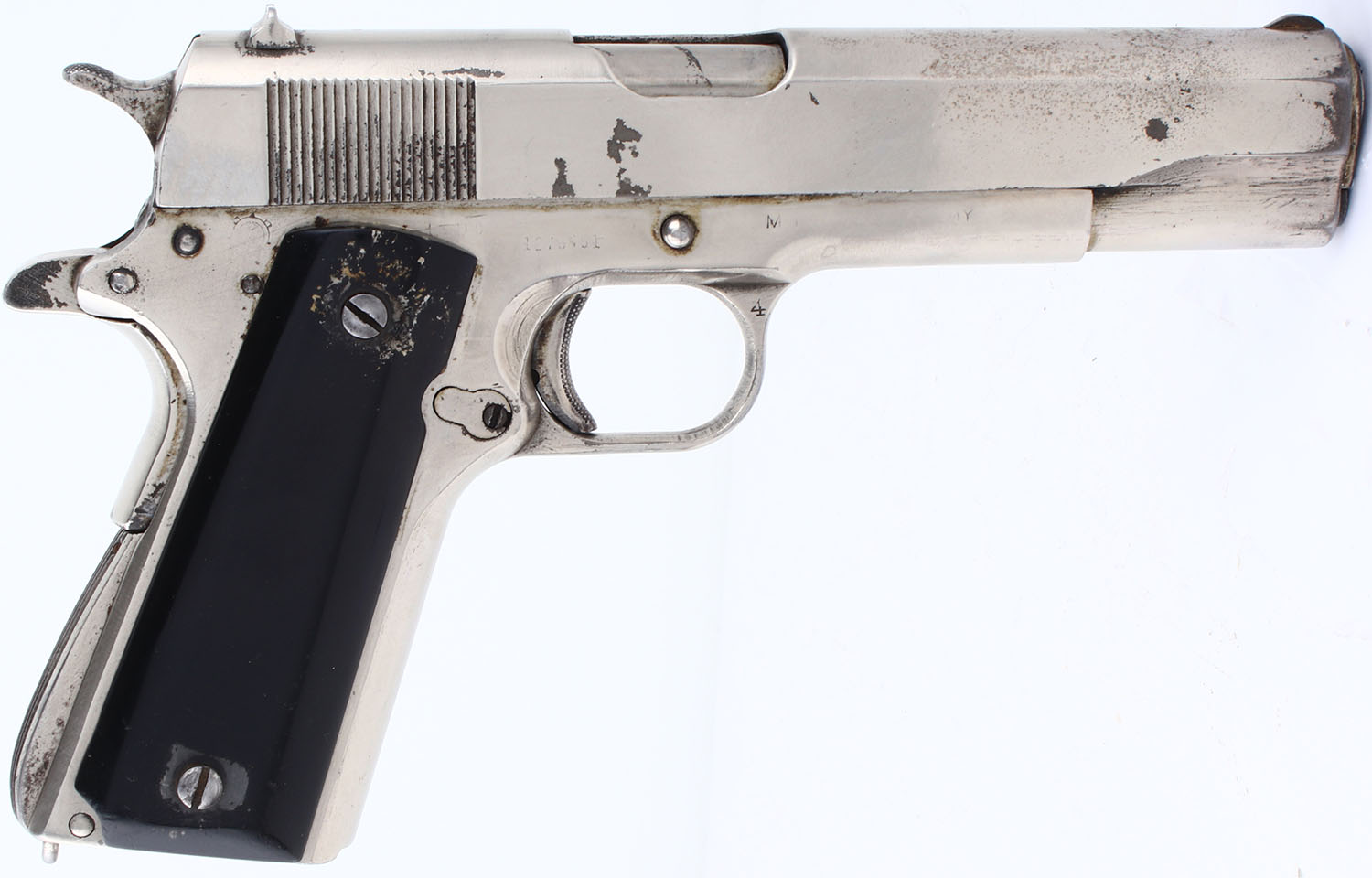 Ithaca, M1911 A1, CAL: .45 ACP, MFG: 1943, SN: 1275451, Semi Auto Pistol, single action only. 5'' barrel. Plastic grips are in fair condition. The nickeled finish on the frame rates 85%, the nickeled finish on the slide rates 80%. The slide and frame have been buffed and nicked. The nickel finish has some chips, patina, and a fairly pronounced scratch pattern from being sanded/buffed. Bore is good, rifling is fairly dark but has no visible pitting or rust. Mechanically solid with some side to side play in the slide. Nickeled sights, front sight integral to the slide, rear sight is set in a dovetail cut on the slide. Comes in a leather holster with no magazine. FFL Req. - Value: 500 to 1000