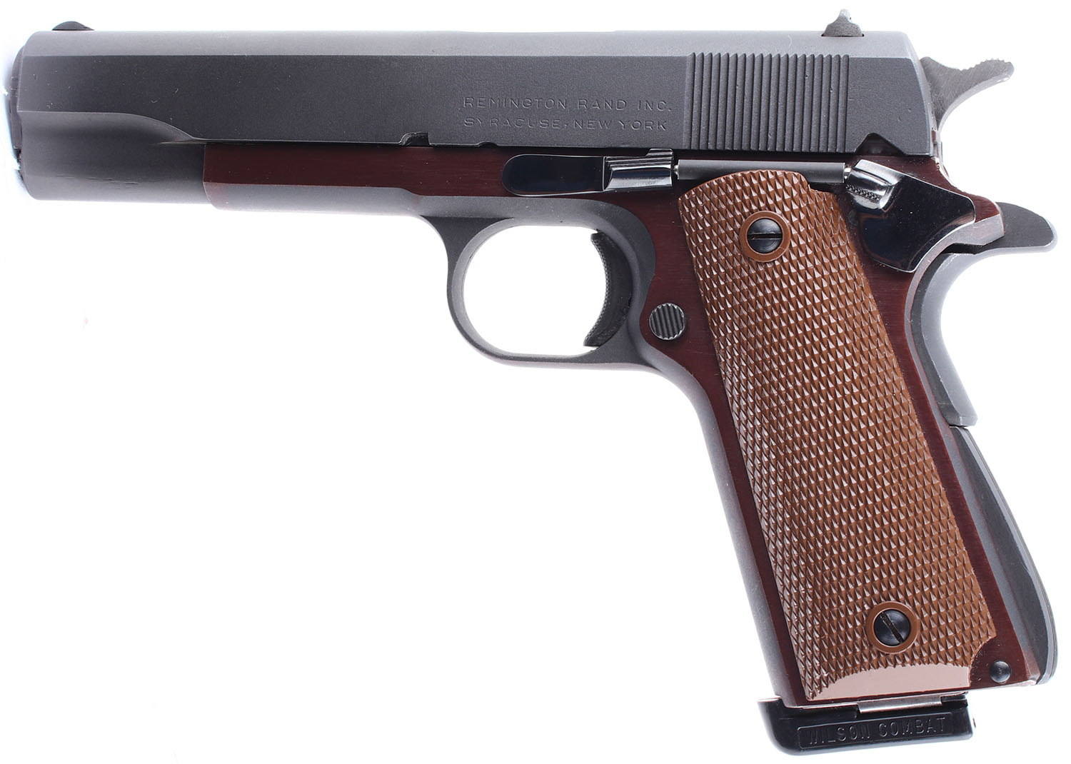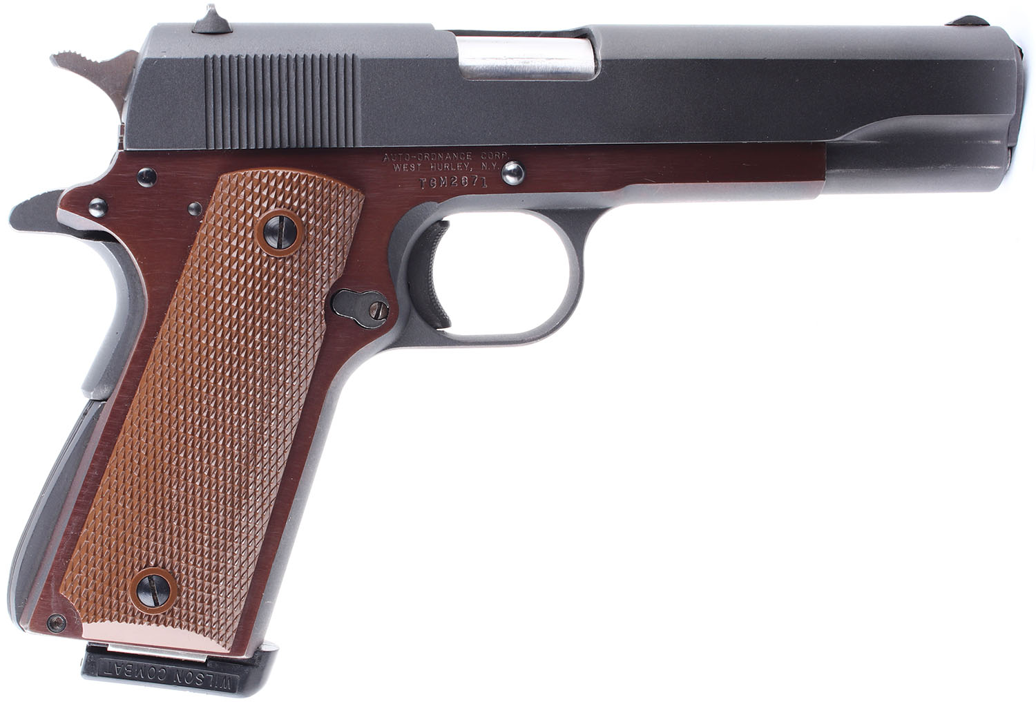 Auto Ordnance (Remington Rand slide), 1911-A1, Asra Mod. 1915 ''Ruby'' CAL: 45 ACP, MFG: Modern, SN: TGM2871, Semi Auto Pistol. 5 barrel. The textured plastic grips are in excellent condition. The frame has a plum toned aftermarket finish which is a mix of the original parkerized & the new finish. The finish covers almost all of the left & right sides of the frame. The slide is marked Remington Rand Inc. Syracuse, New York & appears to have been re-parkerized. The new parkerized finish rates 99%. The bluing on the safety & slide stop/slide release is mostly intact, with slight handling wear. Bore is excellent. Mechanically solid, with some side to side & up & down play in the slide. Blacked out sights. Rear sight is set in a dovetail cut on the slide, front sight is integral to the slide. Comes with a Wilson combat magazine. FFL Req - Value: 400 to 800
