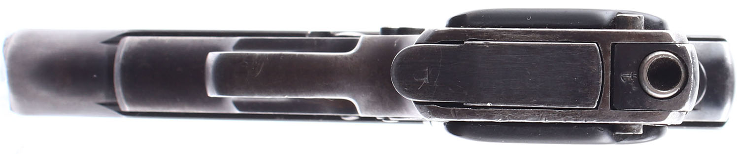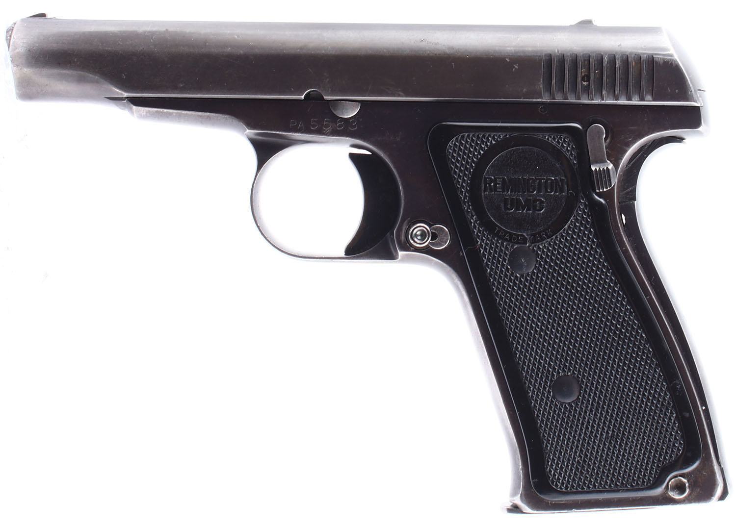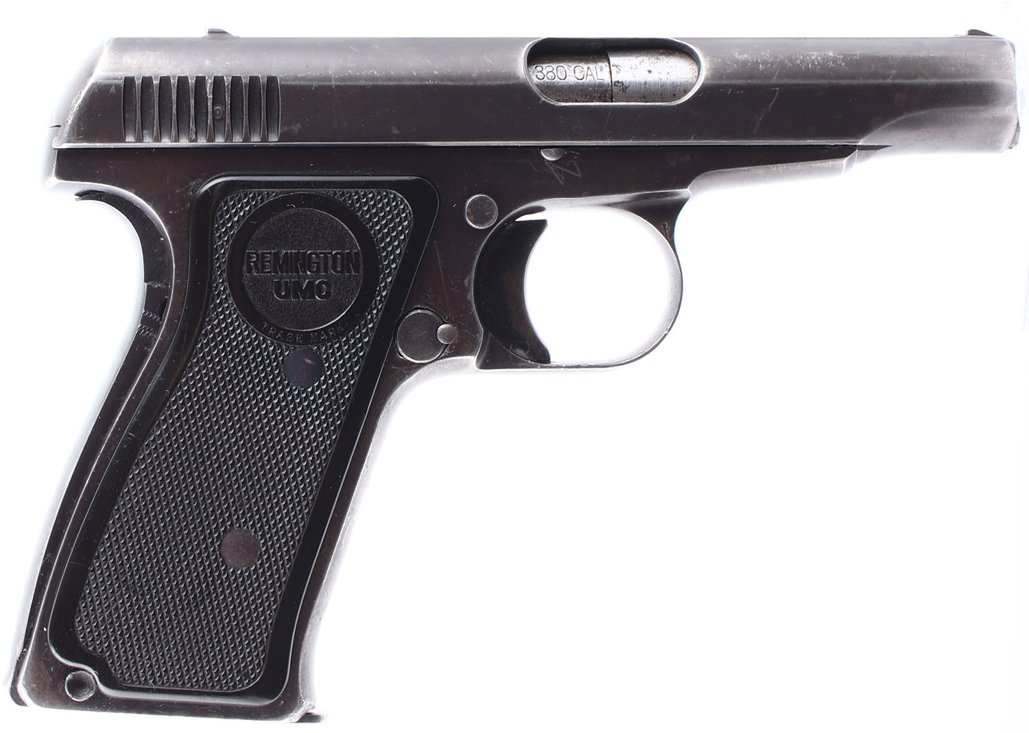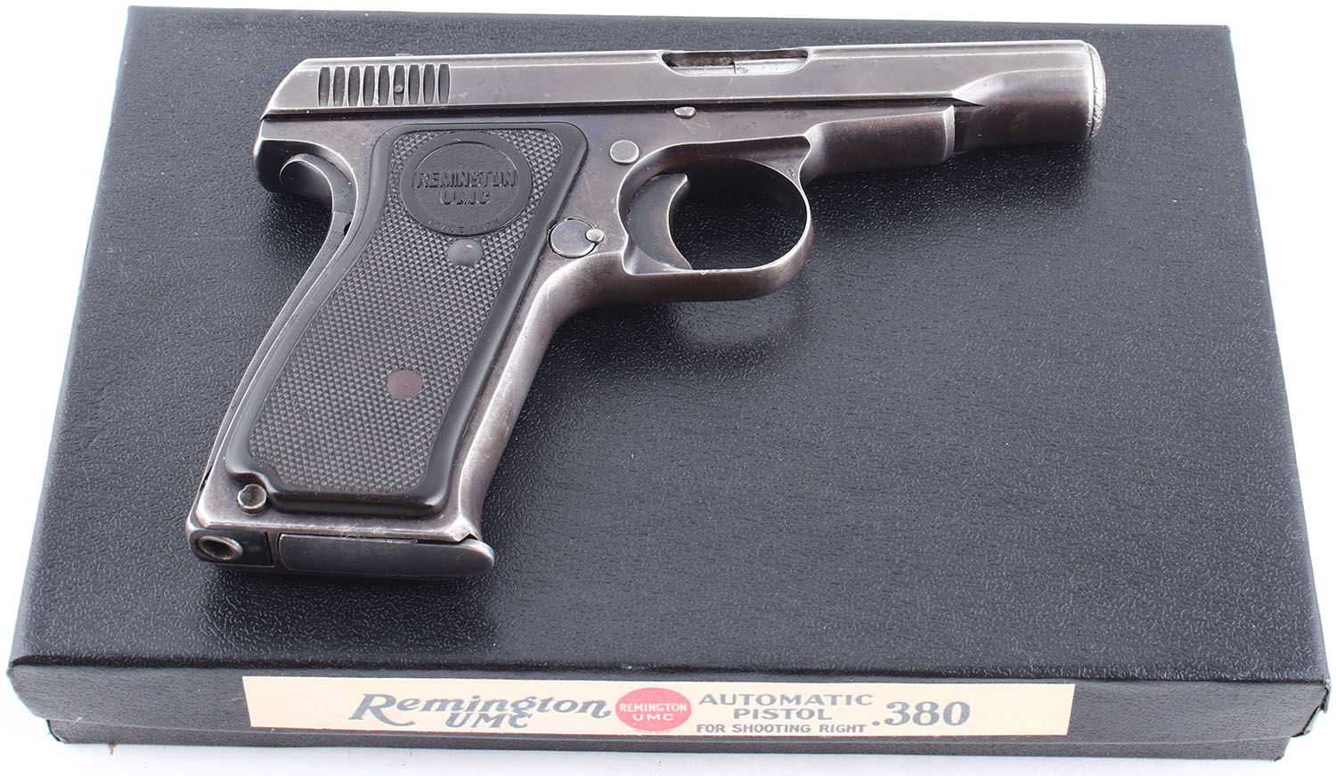 Remington, Model: 51, CAL: 380 ACP, MFG: 1918-26, SN: PA5583, Semi Auto Pistol. 3 1/4'' barrel. The plastic grips are in very good condition with slight wear. The bluing on the frame rates 80%, while the bluing on the slide rates 75%, there is consistent handling wear throughout with some scratches and dings on the muzzle and end of the slide near the muzzle. Bore is good, slightly dark with some pitting and even roughness. Mechanically solid with very little side to side play in the slide. Rudimentary low profile pistol sights are integral to the slide. Comes in a modern reproduction box with one magazine, and a reprint registration card and pamphlet. FFL or C&R Req. - Value: 400 to 700