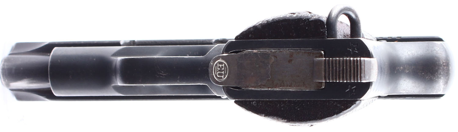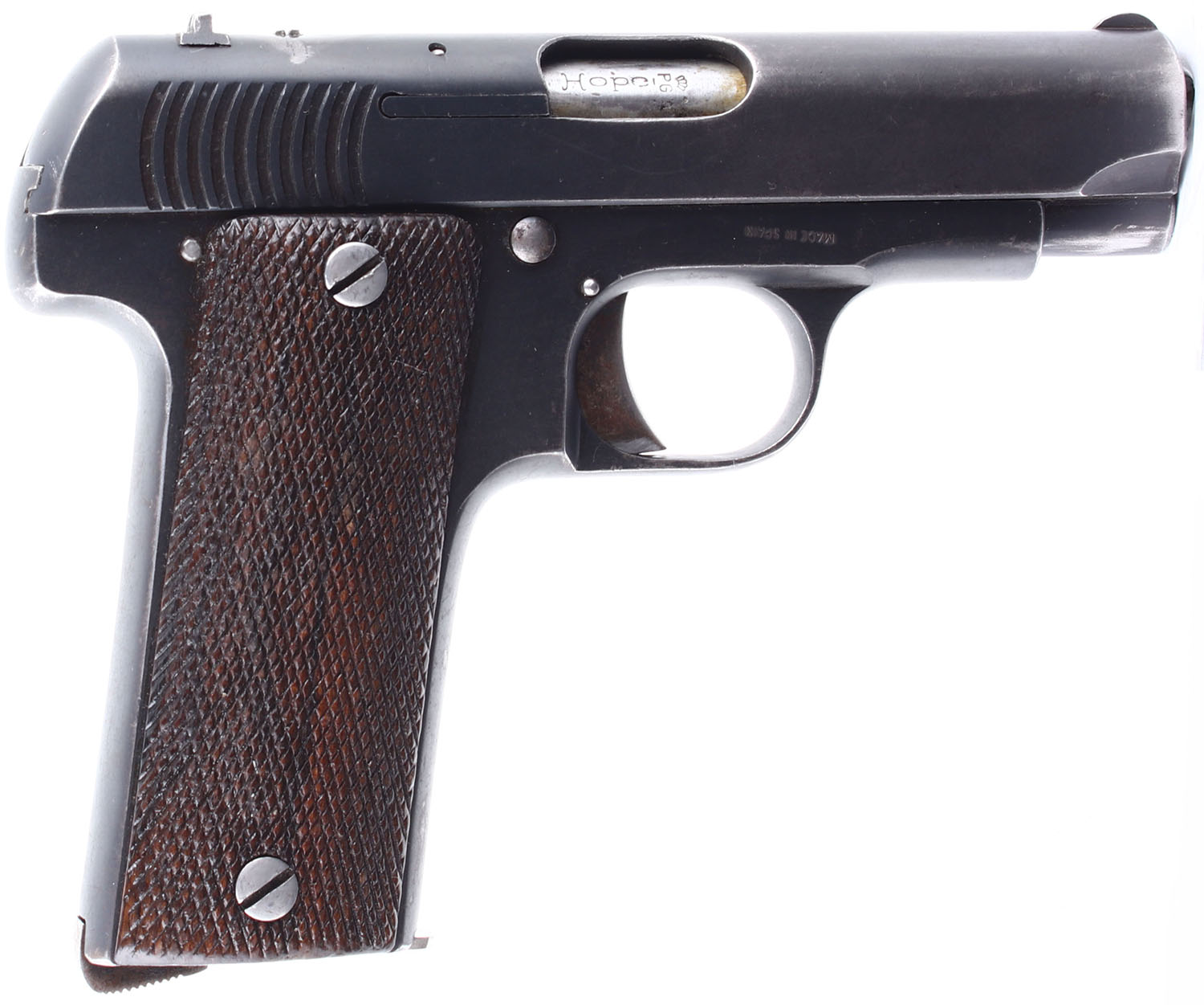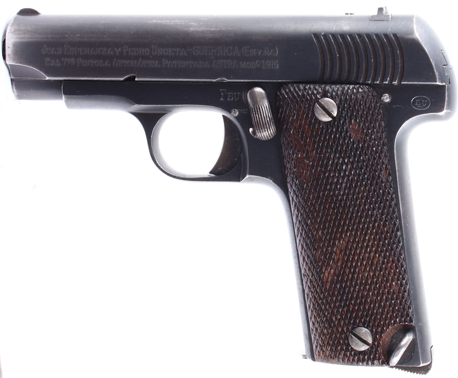 Juan Esperanza Y Pedro Unceta (Spain), Astra Mod 15 Ruby, CAL: 32 ACP, MFG: 1915, SN: NONE, Semi Auto Pistol. 3 3/8 barrel. The checkered wood grips are in good condition with substantial handling wear, scratches and dings but are intact and solid. The frame and slide rates 82% and has some handling wear and patina mostly concentrated on the trigger and front of the grip. Bore is very good, has darkened and has light roughness throughout with more substantial roughness near the muzzle. Mechanically solid. Blacked out sights, rear sight is set in a dovetail cut on the slide, front sight is integral to the slide. Comes with a magazine. FFL or C&R Req. - Value: 300 to 600
