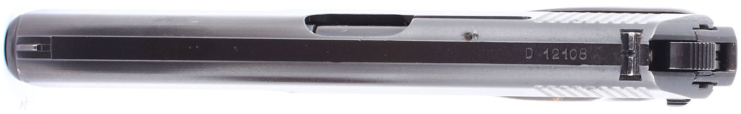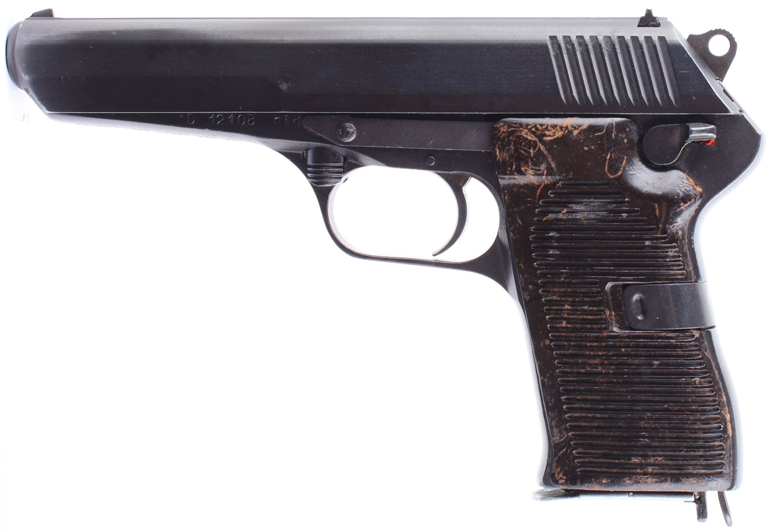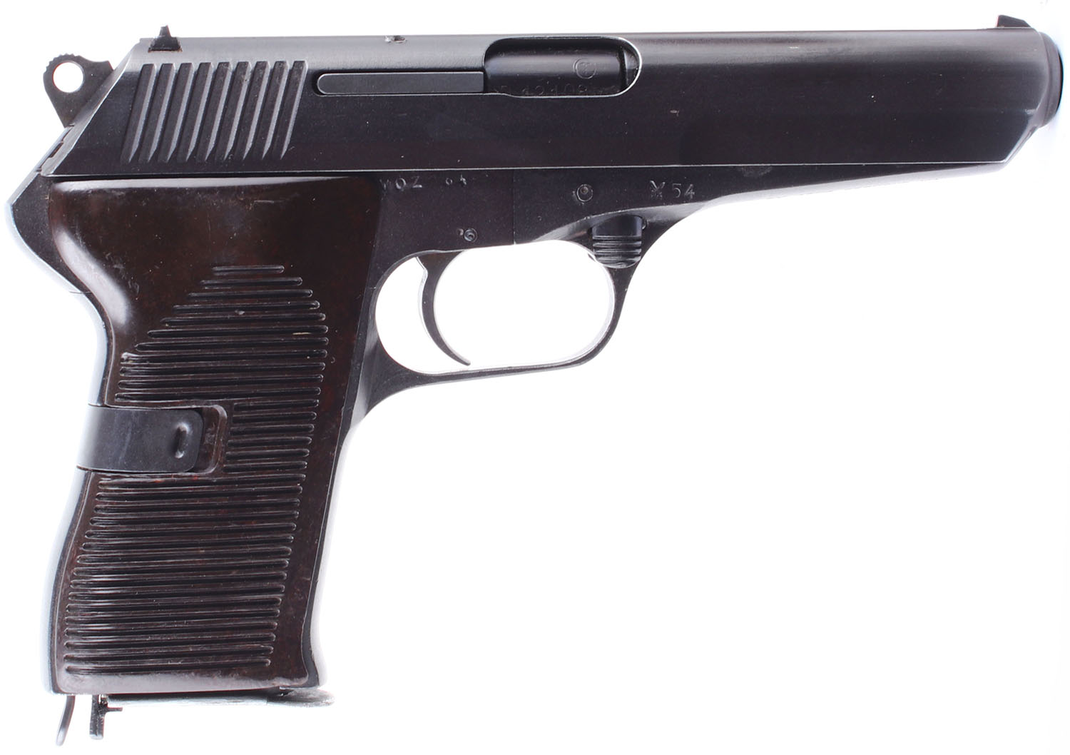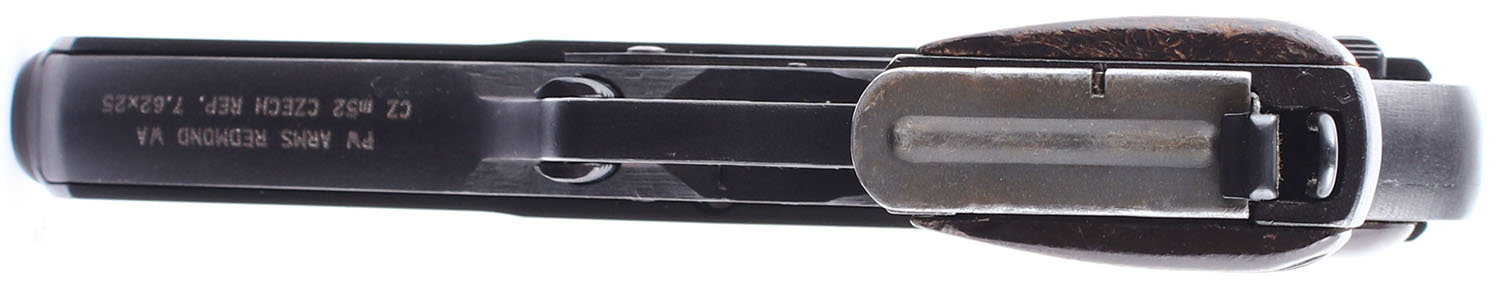 Ceska Zbrojovka (CZ), VZ. 52, CAL: 7.62x25, MFG: 1954, SN: D 12108, Semi Auto Pistol, single action only. 4 1/2 barrel. The Bakelite grips are solid. The right grip panel is very good, with slight handling wear, while the left grip panel rates good, with some small chips, substantial scratches & discoloration. The arsenal refinish on the frame & slide rates 98%. Bore is good, darkened, with even roughness. Mechanically solid. Steel sights, with rear sight is set in a dovetail cut on the slide, front sight integral to the slide. Comes with a magazine & a VZ52 holster. FFL or C&R Req. - Value: 250 to 600