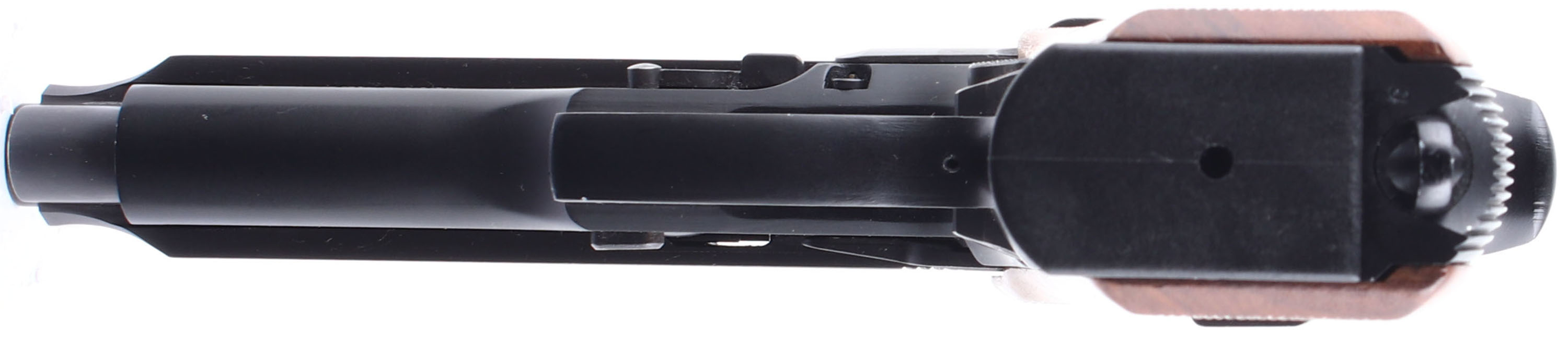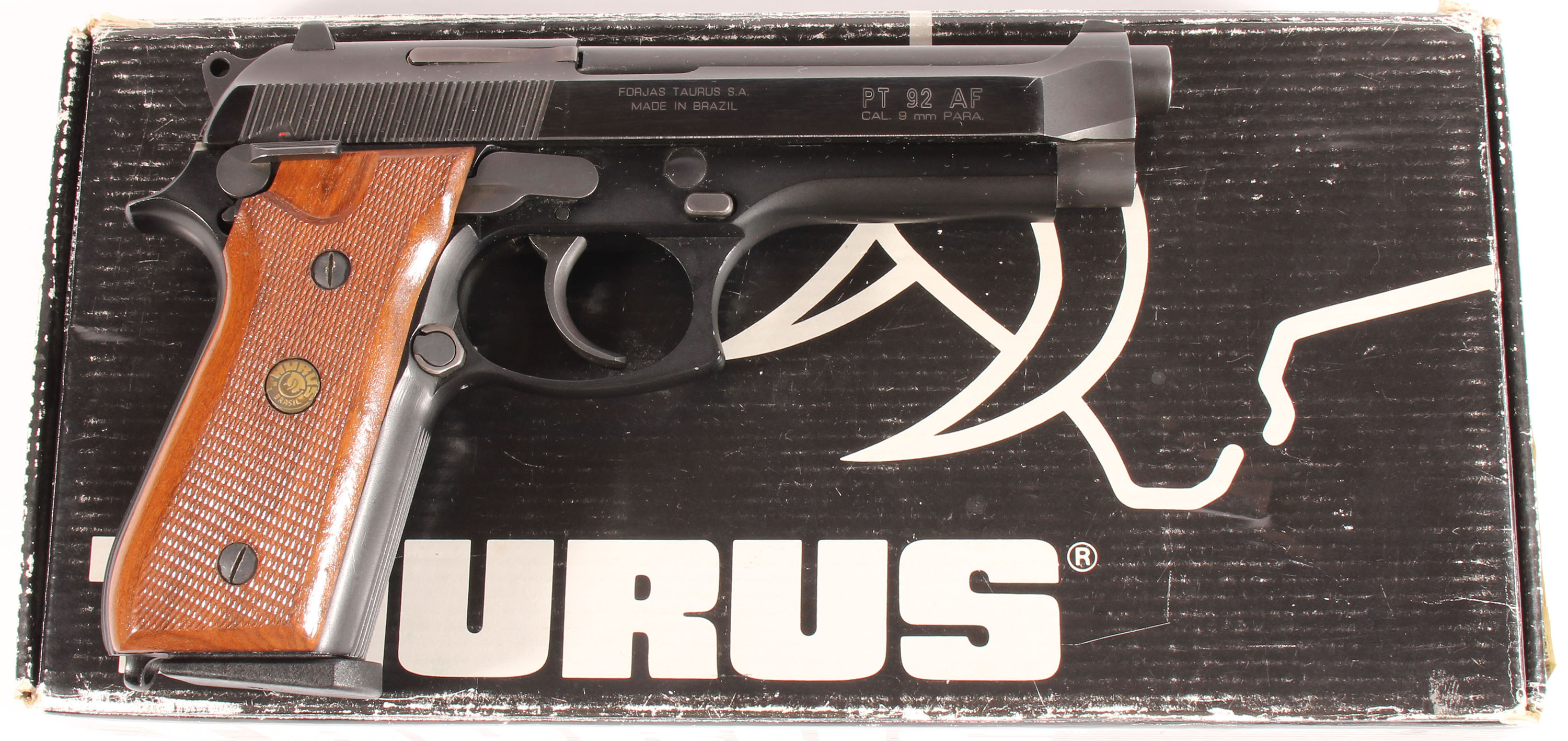 BOXED, Taurus, PT 92 AF, CAL; 9x19mm, MFG: Modern, SN: TND71397, Semi Auto Pistol, 4 3/4'' barrel. Factory markings. The original checkered wooden grips are excellent. The black metal finish on the barrel rates 99%, while the matte black finish on the frame rates 98%. Bore is excellent. 3 dot white combat sights, with integral front sight. Comes in factory box, with one factory 10 rd Mecgar mag & two extra 10 rd pro mags. FFL Req. - Value: 250 to 500