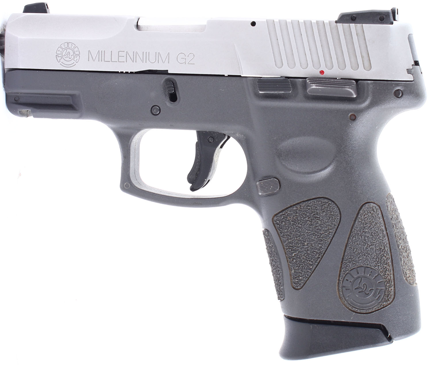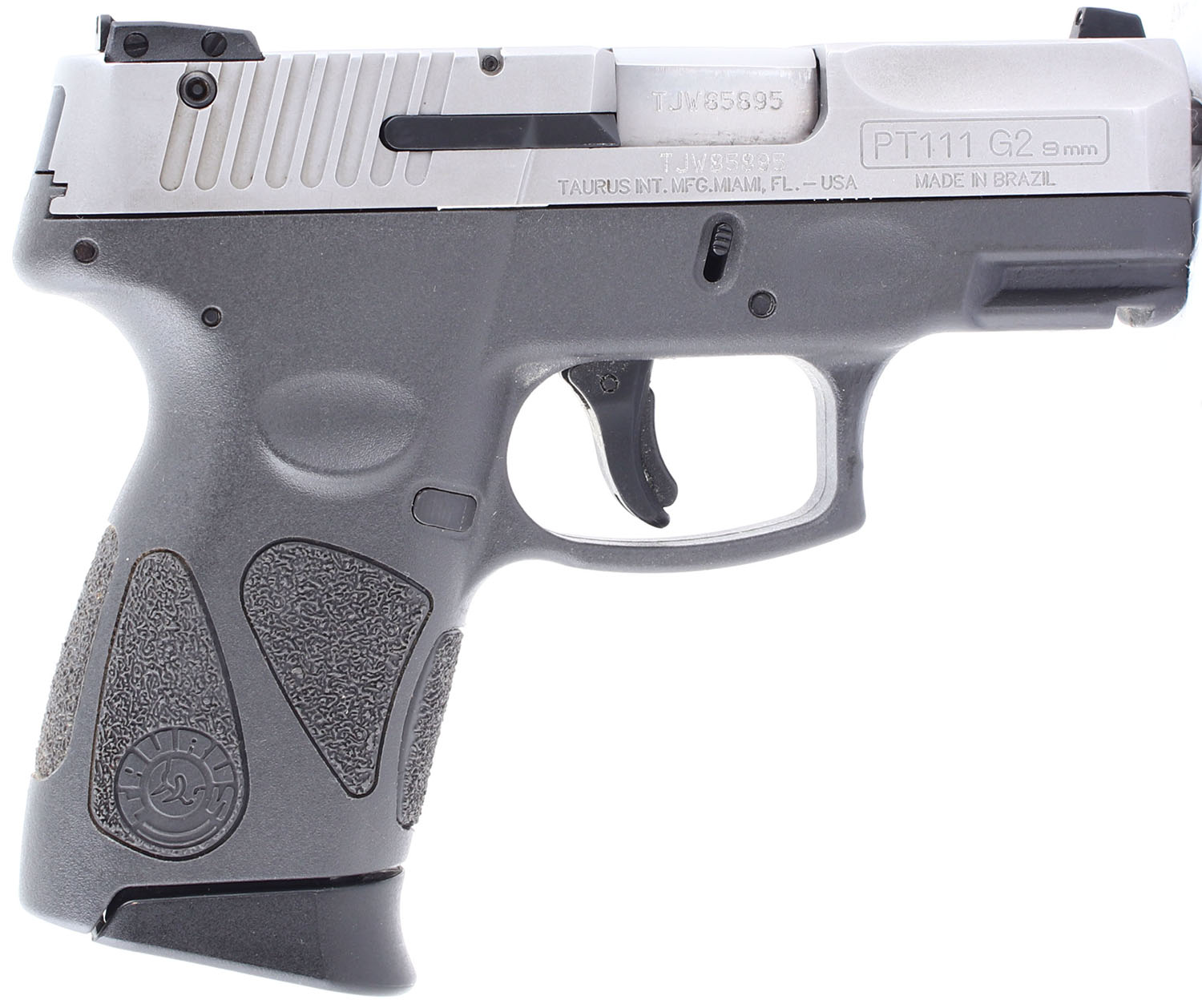 Taurus, PT111 G2 Millennium, CAL: 9x19mm, MFG: Modern, SN: TJW85895, Semi Auto Pistol, Double/single action, Thumb safety on left hand side of the frame (for right handed shooters). 3'' barrel. The gray Taurus textured polymer grip frame is excellent, with some very minor handling wear. The gray metal finish on the slide rates 97%. Bore is excellent. Mechanically very solid, with minimal side to side play in the slide. 3 dot white combat sights. Comes with one 12 round magazine. FFL Req. - Value: 200 to 350