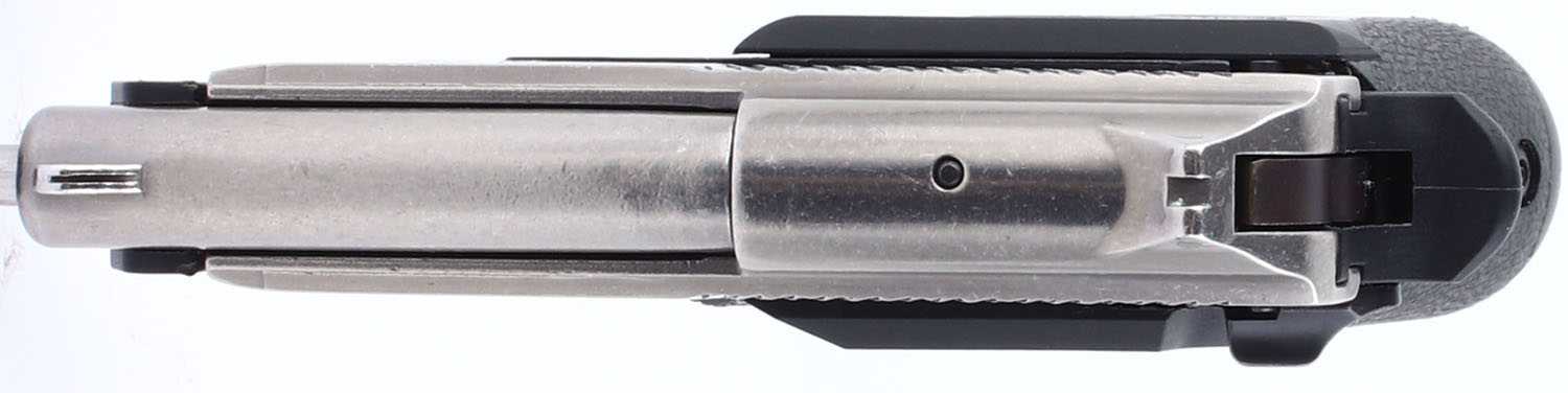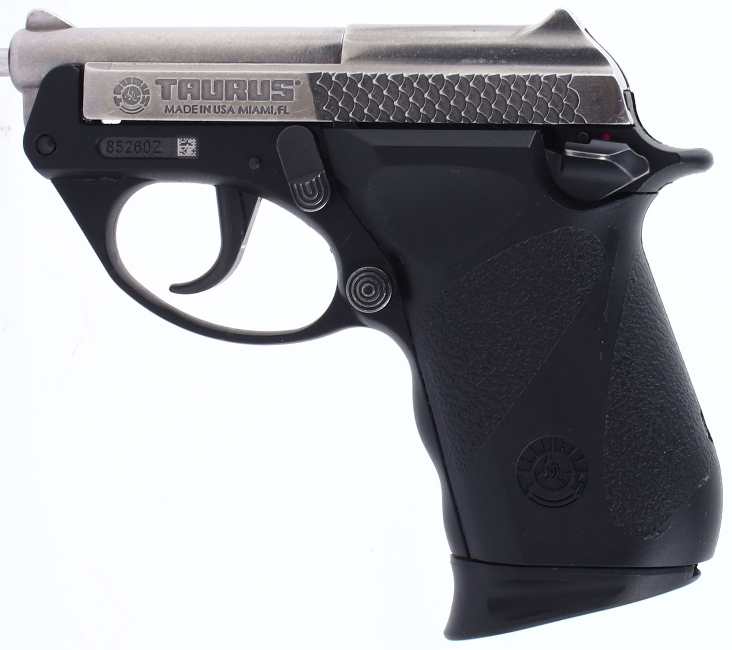 Taurus, PT 22, CAL: 22lr, MFG: Modern, SN: 85260Z, Semi Auto Pistol, Double action only, Thumb safety on left hand side of the frame (for right handed shooters). 2 1/4'' barrel. The black Taurus textured polymer is very good, with minor handling wear. The stainless steel finish on the slide rates 99%. Bore is very good. Mechanically very solid, with very little side to side play in the slide. Integral rear notch & front post sights. Comes with one 8 round magazine. FFL Req. - Value: 100 to 250