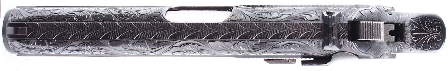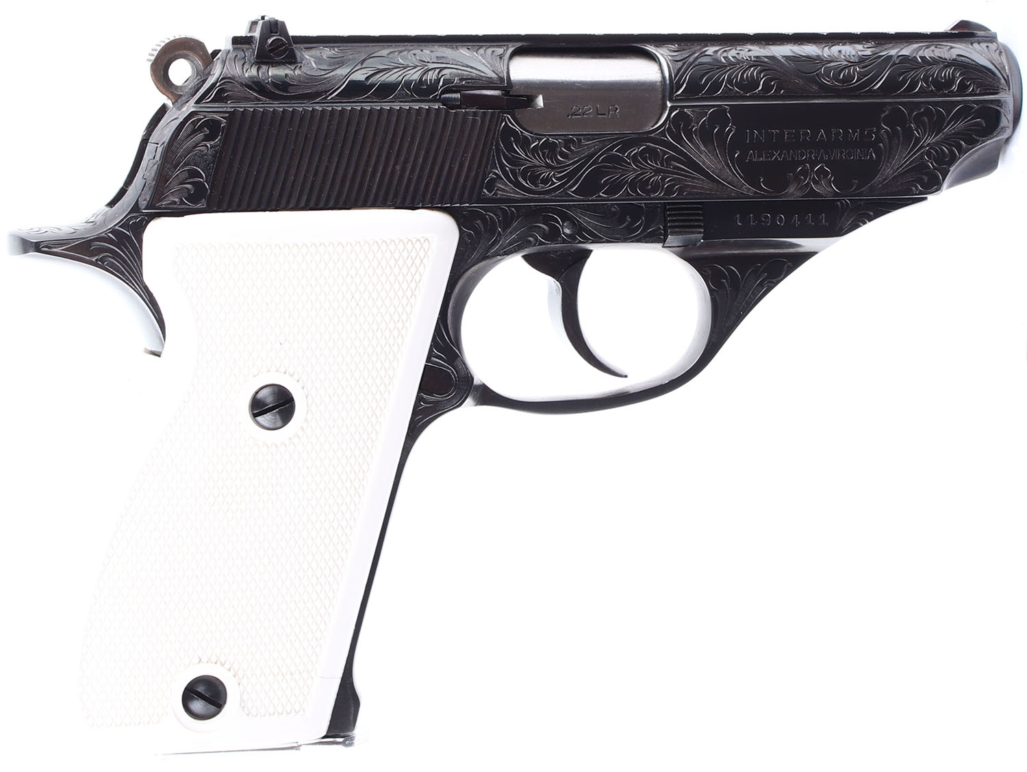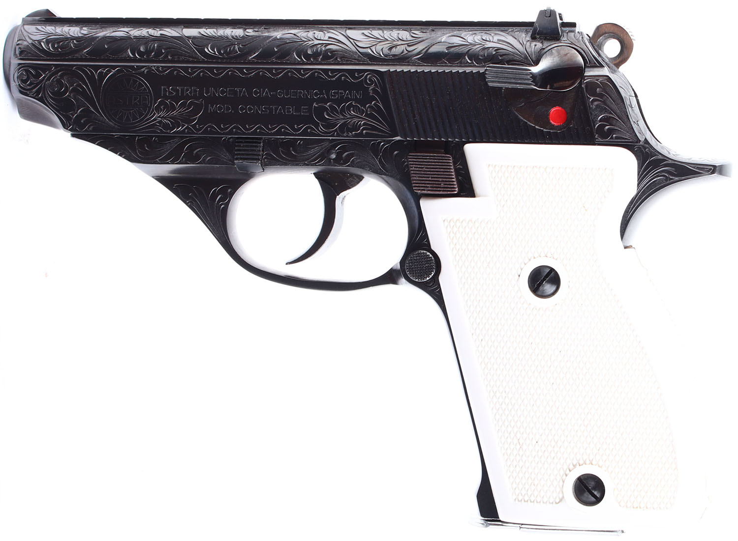 ENGRAVED Interarms (Astra Unceta CIA, Spain), Constable, CAL: 22LR, MFG: Modern, SN: 1190411, Semi Auto Pistol. 3 1/2'' barrel. The checkered white polymer grips are in very good condition, but with a single stress crack on the lower portion of the right grip panel edge to screw. The slide & frame display very nicely executed floral & scroll hand engravings. The metal blued finish on the slide & frame rates 99%. Bore is excellent. Mechanically solid. Blacked out sights, rear sight is set into a dovetail mount on the slide, front sight is integral to the slide. Comes with a magazine. FFL Req. - Value: 600 to 800