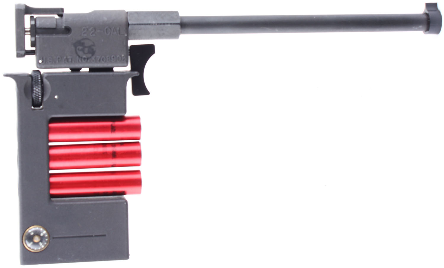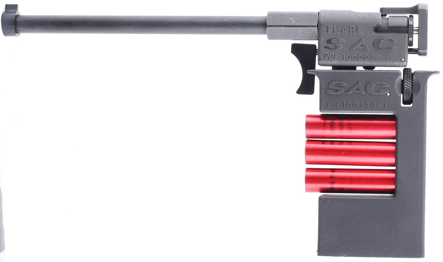 The trigger assembly has a threaded breech that can receive either the .22lr barrel or flares. The grip has three threaded positions that each hold a flare cartridge marked Penguin Aerial Signal Flare Cartridges (SFR - 2). The bottom of the grip has a compartment that holds 12 rounds of 22LR. There is a compass built into the bottom of the right hand side of the grip. Comes with a knife/saw blade that can be mounted to the handle, a ferro rod, and an instruction manual.