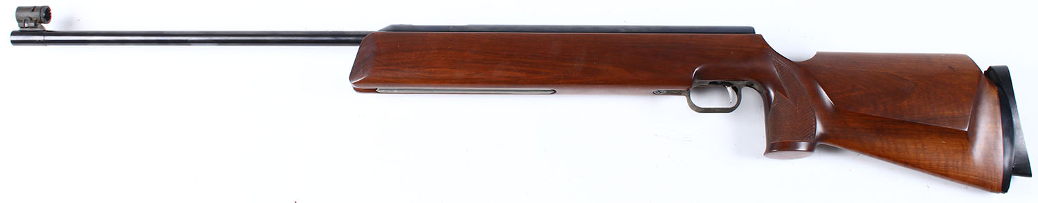 CASED, Anschutz-Match, Model 250, CAL: 4.5mm or .177, MFG: N/A, SN: 51254, Pump, 18'' barrel. The checkered & cheeked target stock is excellent. The metal blue finish rates 97% overall. Bore is excellent. Large hooded front sight. Rear sight included, but not attached. Comes in custom wood case, with rear sight & related paperwork. Grade: Excellent. No FFL Req. - Value: 300 to 600