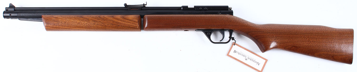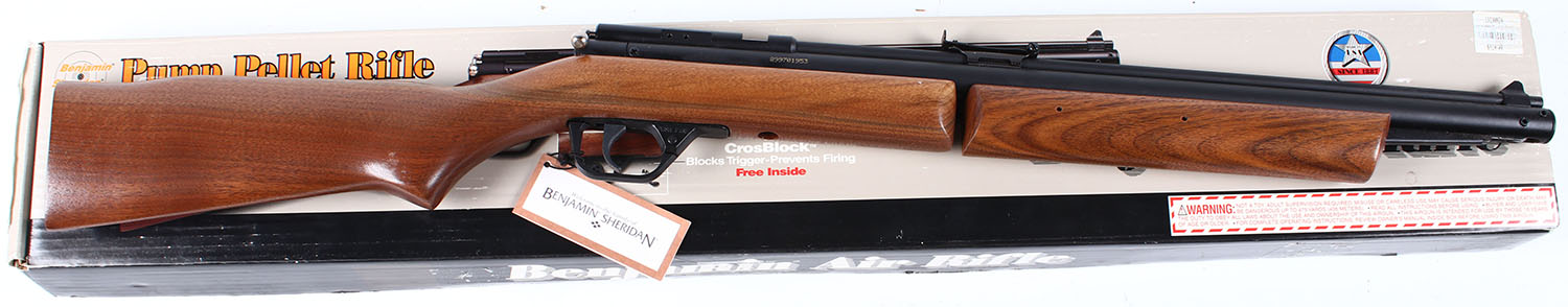 BOXED Benjamin, Model 392 Pellet, CAL: .22 or 5mm, MFG: 1992-Current, SN: 899701953, Pump Pneumatic, 19 1/4'' barrel. Swinging forearm multi pump pneumatic action. The flat pistol grip wood stock & finish are excellent. The metal black finish on metal components rate excellent. Bore is excellent. Fitted with an adjustable rear & blade front sights. Stock manufactured without a buttplate. Comes in the original box, with hang tag. Basically new old stock. Collectible original condition. Overall excellent. No FFL Req. - Value: 100 to 180