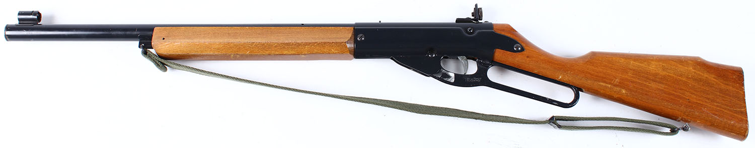 Daisy, Model 99 Target Special, CAL: .175 BB, MFG: 1960's SN: NA, Lever, The straight grip wood stock & forearm are excellent, with a few minor finish level marks to the excellent finish. The metal blue painted finish rates excellent. Metal lever. Fitted with a factory target sights. Stock manufactured without a buttplate. Carries what daisy referred to as a ''web sling''. Comes with five tubes of BB's. Appearance is excellent. No FFL Req. - Value: 30 to 100