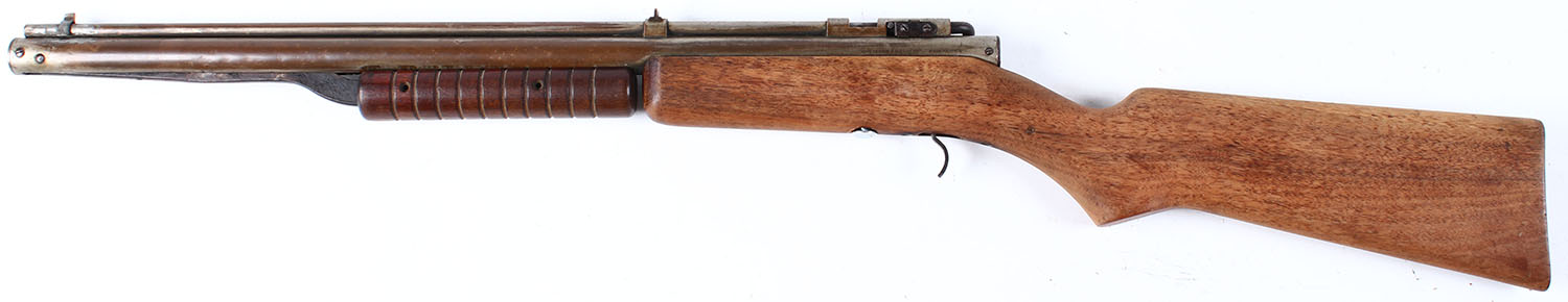 Benjamin Franklin, Model Air Rifle 312 Smoothbore, CAL: .22, MFG: 1940-69 SN: NA, pump, The flat pistol grip wood stock is very good, but without finish. Factory finish on forend. There is a small edge chip at the buttend. The metal nickeled finish has mostly worn away. Fitted with a fixed ''V'' notch rear & blade front sights. Front sight, which also holds barrel to compression tube is loss. Stock manufactured without a buttplate. Left side forend screws missing. No trigger guard. Replaced stock to barrel screw. Does not appear to have compression. A great restoration project. No FFL Req. - Value: 10 to 30