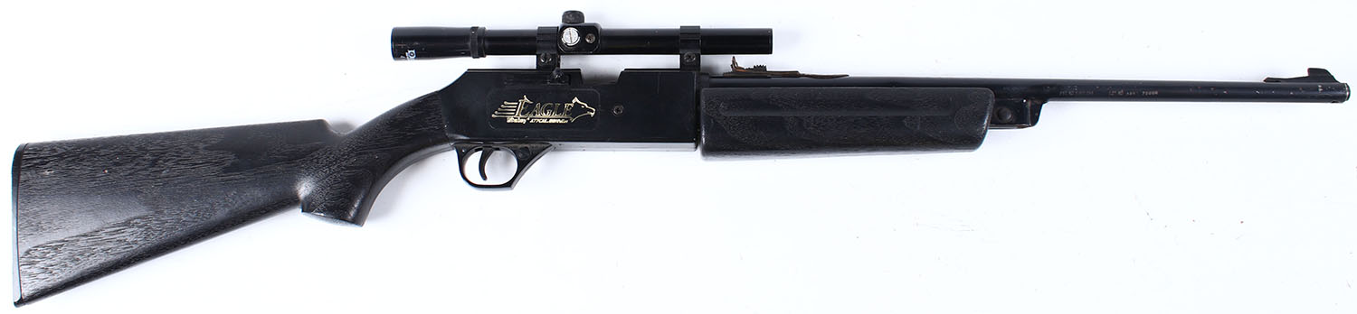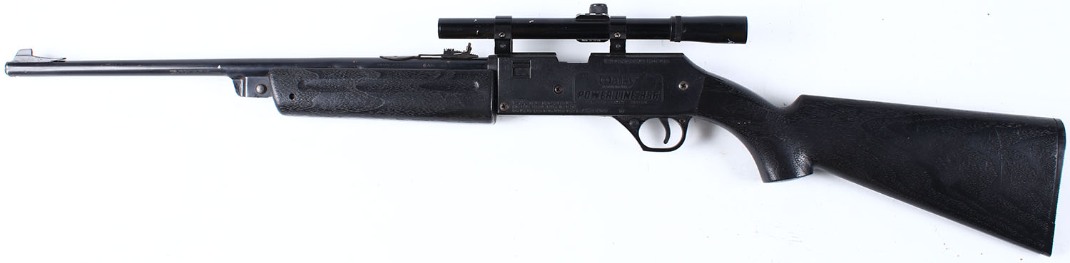 Daisy. Model Eagle Powerline 856, Cal: .177. Pump. 20'' Rifled barrel. Black plastic stock is excellent. The, metal finish rates 80%, but with some rust spotting on barrel & around rear sight. Mounted with a Daisy 4X15 scope, an adjustable rear & blade front sights. Grade: Good. No FFL Req. - Value: 10 to 30