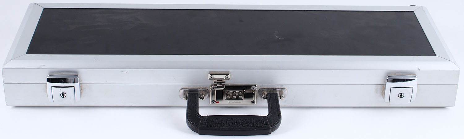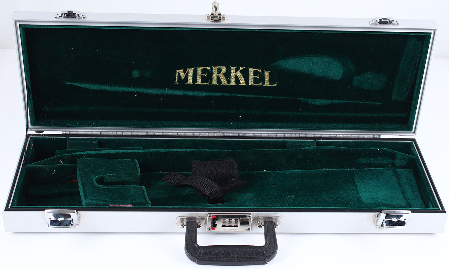 Merkel Double Rifle case, aluminum & plastic exterior with leather handles, green felt interior with gold ''Merkel'' embroidery, measures 26'' x 8'' x 3'', does not have key. Grade: Excellent - Value: 50 to 150