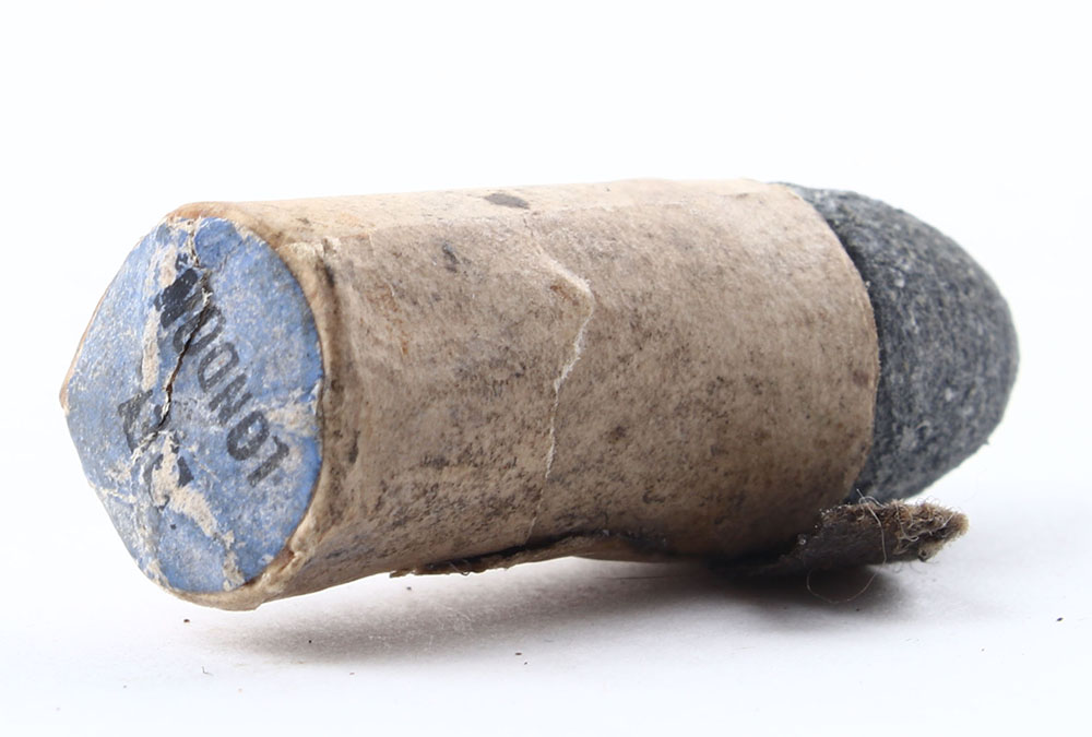 75 Bore (.41 Caliber) Eley Needlefire. Blue label at base ''Eley London''. RN Lead with black pull tab. Small tear in paper outer case. Grade: Good - Value: 20 to 30
