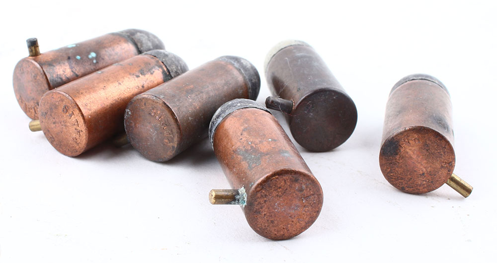 Lot of 6. 12mm Pinfire. HS:''H B PARIS'', RN Lead. Copper case by Houllier-Blanchard. Grade: Very Good - Value: 30 to 60