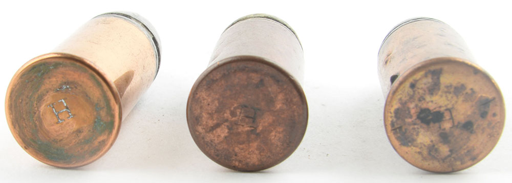 Lot of 3 = 56-50 Spencer, all impressed H, 1 dummy with wood rod, 2 standard cartridges with knurled grooves. Grade: Excellent - Value: 70 to 100
