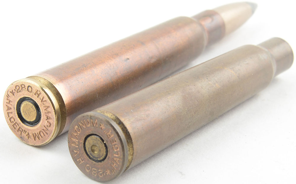 280 Halger Magnum. HS:''280 H.V. MAGNUM * 280 *'', PT CN SP with steel color tip. Crack in neck. Also one fired case. Grade: Very Good - Value: 50 to 100