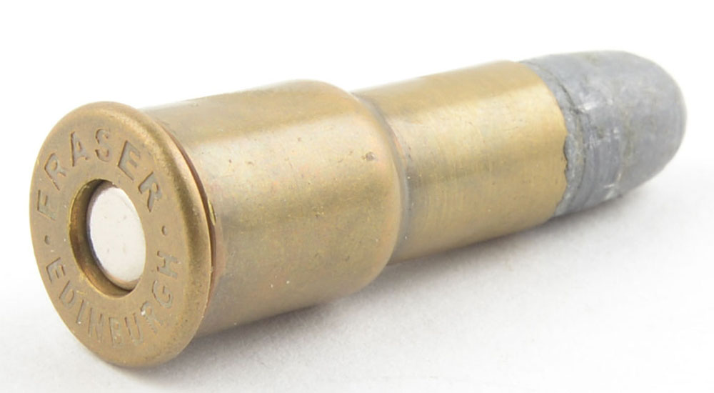 360/300 Fraser. HS:'' FRASER . EDINBURGH .'', RN Lead. This cartridge is believed to have been made in South Africa for collectors who wished to have an example of this rare cartridge but are unable to obtain one. This one does NOT have a small R on the side of the case indicating a replica. Grade: Excellent - Value: 20 to 40