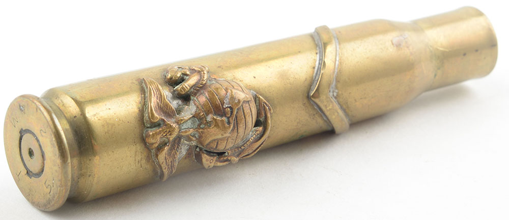 .50 BMG Fired Case. Trench Art. Has USMC emblem and one rank stripe cemented to case. HS:''T W 2 5''. Grade: Excellent - Value: 4 to 40