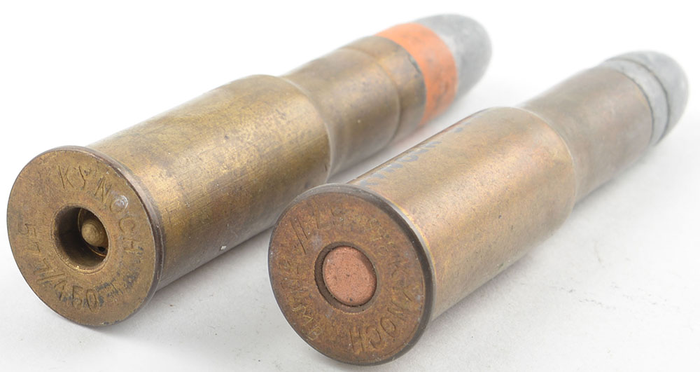 Lot of 2. 577/450 Martini Henry. (2) KYNOCH 577/450''. 1--RN Orange PP Lead, no primer DUMMY. 1--RN Lead, different style of bullet with 2 visible grooves. Grade: Very Good - Value: 20 to 40