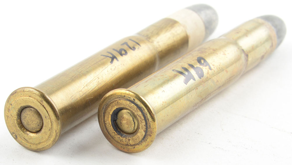 Lot of 2. 44-90 Sharps & Remington Bottleneck (2.6'' case). NHS. (1) FN PP Lead. (1) FN PP Lead Board Dummy with two mounting holes and one punch crimp near casemouth to hold bullet. Grade: Very Good - Value: 60 to 100