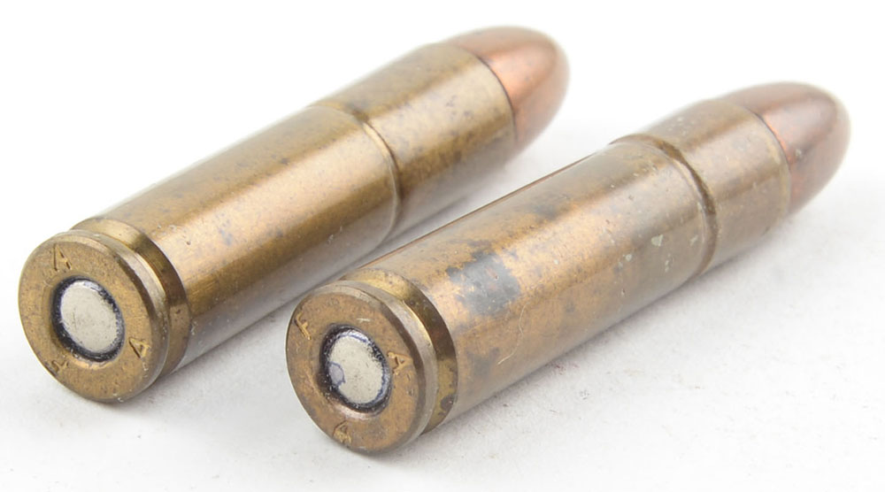 Rare Disc. (2) .30 carbine, FA-4 H/S, (1) smooth cannelure, .420 below case mouth, (1) .290 below case mouth. Grade: Very Good - Value: 20 to 60