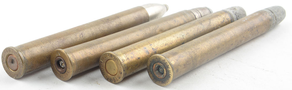 Lot of 4, 9.3x72mmR. All different. (1) HS:''B STAHL SUHL #60E'', FN Lead. (1) HS:''N 9,3x72 NORM'', FN Lead. (1) HS:''sDWMs / 9,2x72R / 77DF /'', PT CN SP. (1) HS:''N 360-9,3x72D'', FN Tinned SP. Grade Very Good - Value: 40 to 80