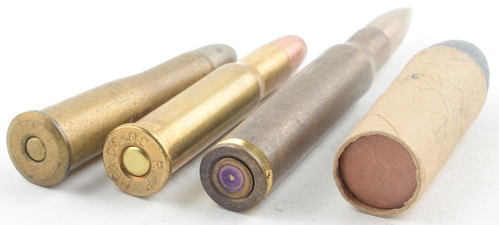 Lot of 4, (1) 32-40 Bullard no h/s, (1) 30-30 '' R - P 30-30 Win'', (1) 30-06 ''4-49 tec 7.62'' ? Subcaliber, (1) Modern 54 cal muzzle cart 108. Grade: Very Good - Value: 10 to 60