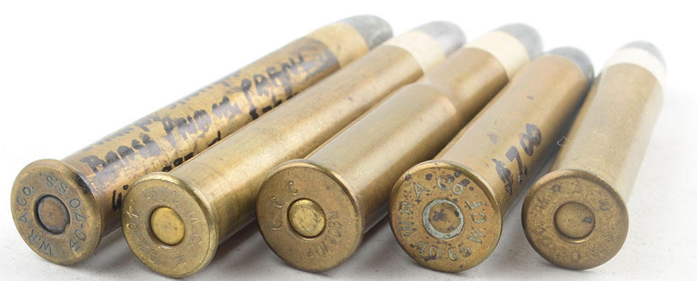 Lot of 5. American Sporting Cartridges. (1) 40-65 Winchester, HS:''W.R.A. Co. 40-65 W.C.F.'', FN Lead. (1) 40-50 Sharps Straight, HS:''W.R.A. Co. 40-50 S.S.'', FN PP Lead. (1) 40-70 Bottleneck, HS:''CCC 40-70BN'', FN PP Lead. (2) 40-70 Sharps Straight, 1--HS:''W.R.A. Co. 40-70 S.S.'', FN PP Lead. 1--HS:''U.M.C. H .40-70. S'', FN PP Lead. Grade Very Good - Value: 30 to 60