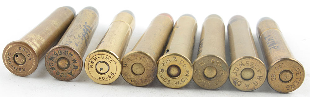 Lot of 8, 40-65 WCF, DUMMIES, (4) wraco, (2) function copper jacket FN, (2) board with wood rods, (1) S UMC H hollow brass bullet, (2) REM-UMC, (1) PETERS. Grade: Excellent - Value: 150 to 250