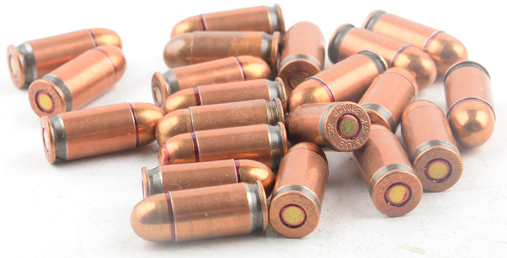 Lot of 21. 380 Auto Pistol. HS:''LVE 02 ,380 ACP 9x17''. RN CJ FMJ. Copper wash steel cases. Grade Excellent - Value: 10 to 20