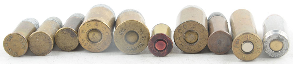 Lot of 11, Pistol & Revolver Cartridges. (3) .320 Revolver by Gevelot. (2) 12mm French by Gevolot. (2) .450 Revolver by Winchester, (1) .320 ''Perfume'' blank, HS:''D&A .320''. .320 Long Rimfire, NHS. (1) 9mm Luger by CCI, (1) 38 Special blank. See photo. Grade Very Good - Value: 10 to 20