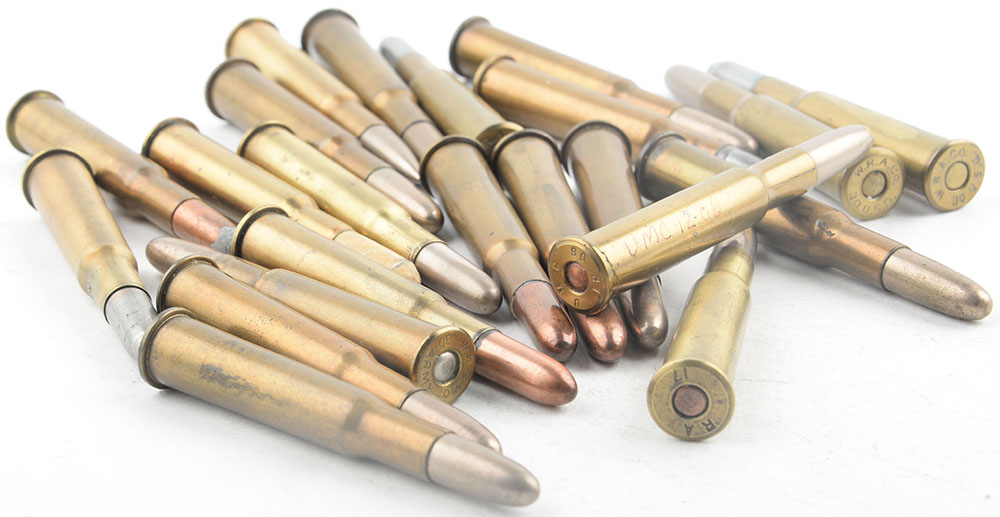 Lot of 22, 30-40 Krag. (8) Commercial Loadings by Winchester: 3--FMJ, 2--RN CN SP, 1--Paper waxed blank, 1--Short range RN Lead, 1--PT CN FMJ. (1) Commercial by REM-UMC, RN CJ SP. (5) Military Contract Ball rounds by: 3--Winchester, 1--Remington, 1--UMC. (8) Military Ball by Frankford Arsenal with varying dates. Grade: Excellent - Value: 20 to 30