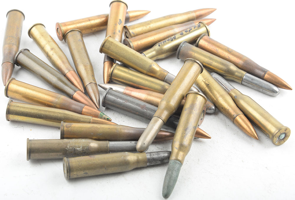 Lot of 24. Mannlicher Military Cartridges. (15) 8x56mm Mannlicher, 11--Hungarian made (including 1 tracer), 2--German made, 1--Austrian made, and 1--Bulgarian headstamped round. (9) 8x50mm Mannlicher including one post-World War I wood blank and one war time guard load. (3) 10.4mm Vetterli, 1--HS:''V.S. * C-94'', 1--HS:''G.D. * C91'', 1-- NHS. All with RN Brass FMJ. Grade Very Good - Value: 20 to 40