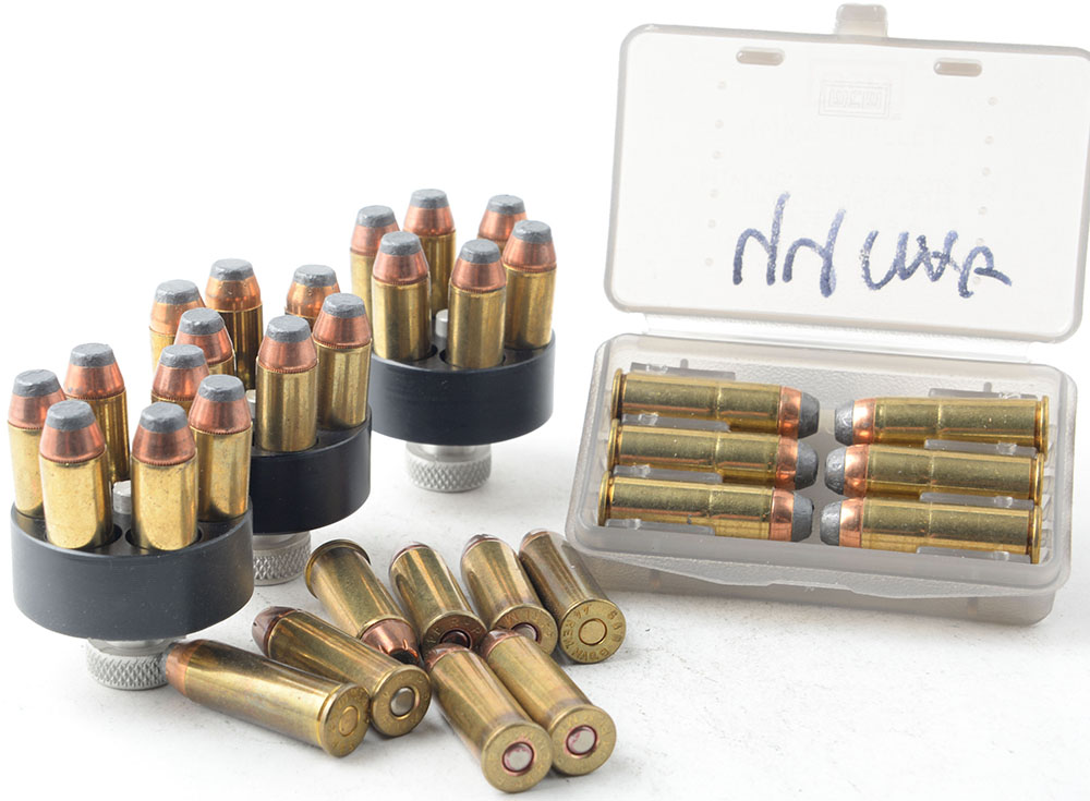 Lot of 32, .44 S&W Magnum. (6) by Remington, HP CJ, (6) by Winchester, FN CJ SP. (2) by Sellier Bellot, FN CJ SP. (18) by Remington, FN CJ SP, in three HKS speedloaders. Grade Excellent - Value: 20 to 40
